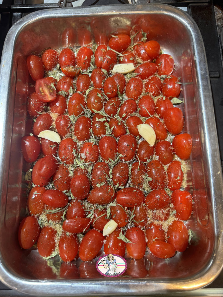 - Eplucher les gousses d’ail, les dégermer et les disposer avec les tomates
