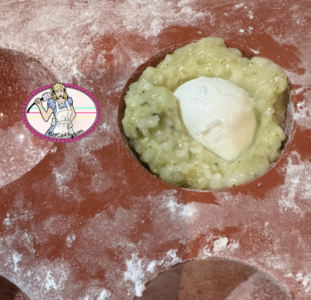 3. Déposer un petit point de pesto ( poché dans une poche pâtissière) sur le fromage puis refermer avec un peu plus de riz de façon à bien recouvrir la mozzarella