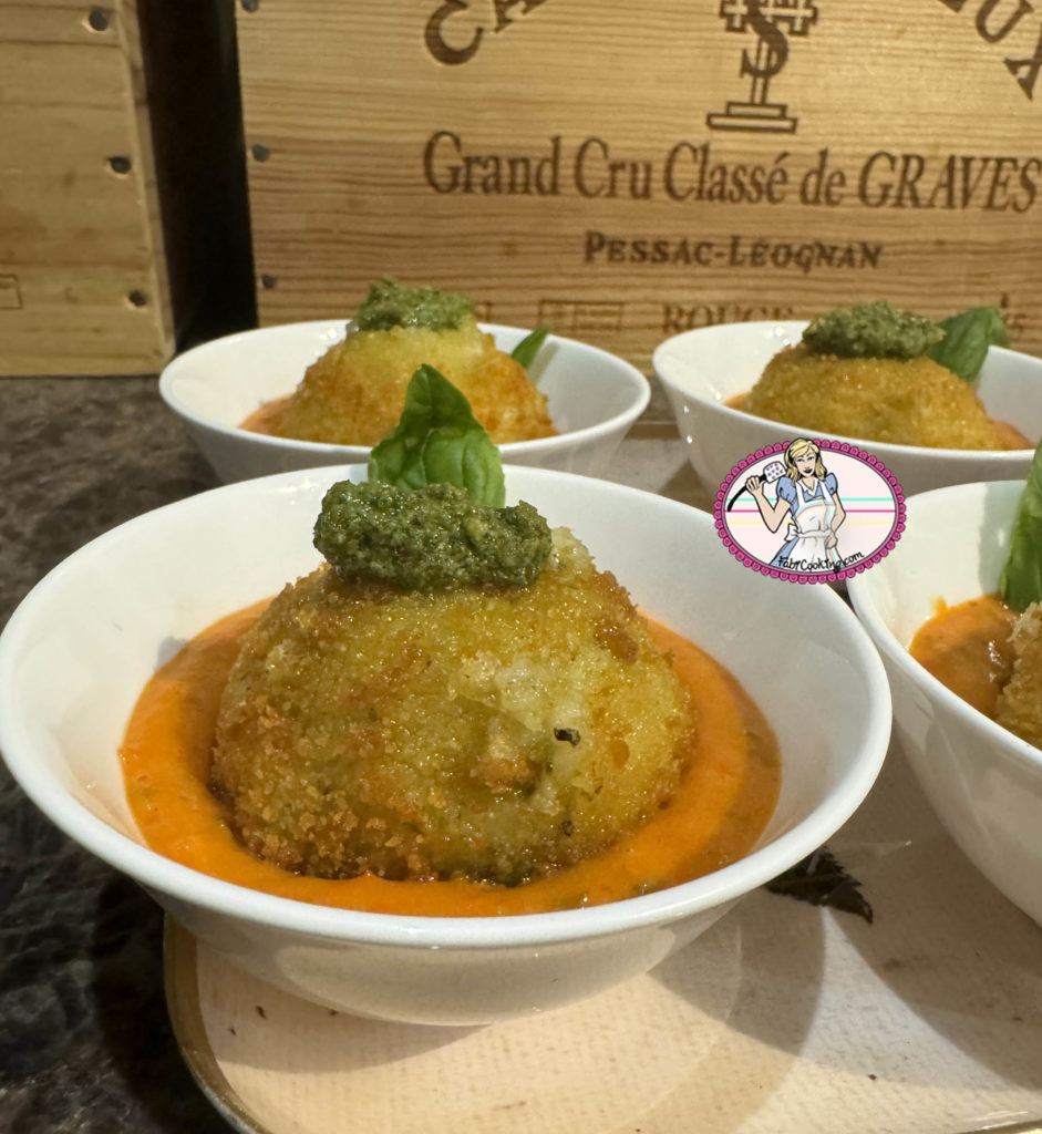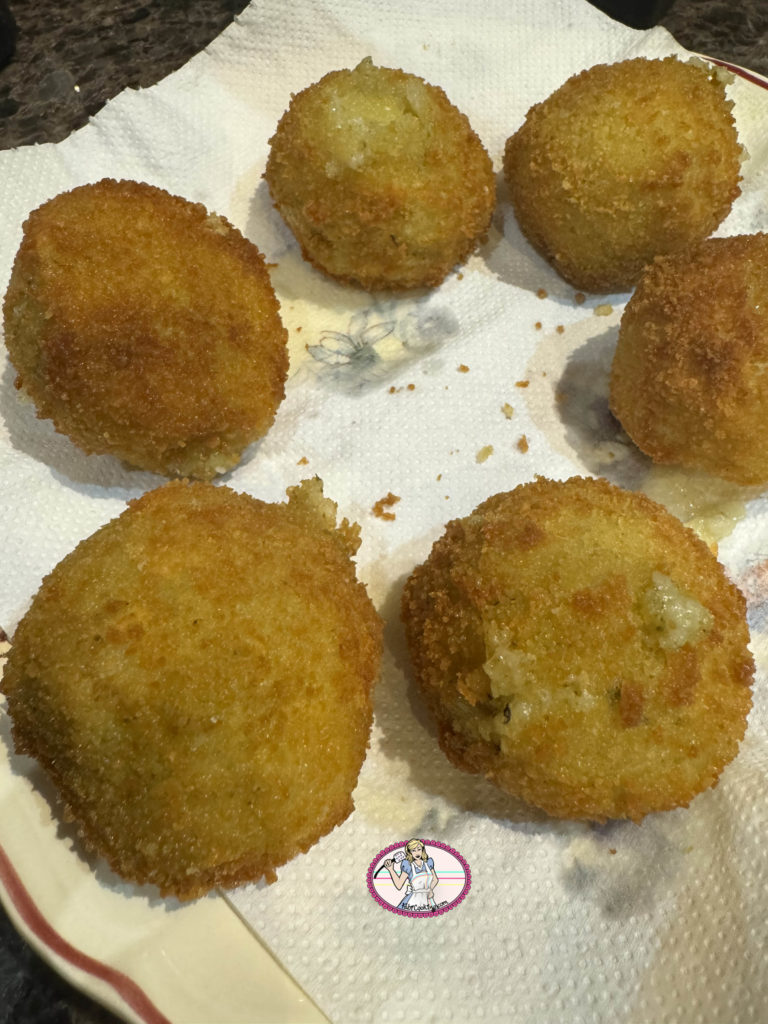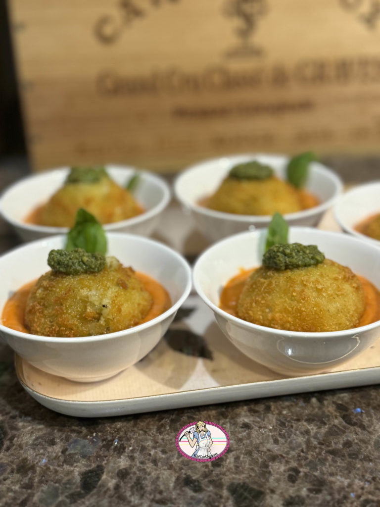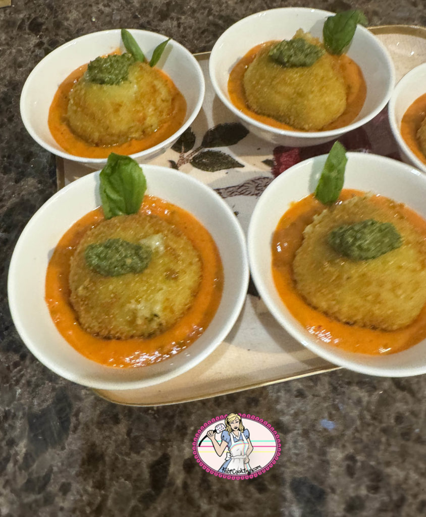 Je vais donc vous faire découvrir une délicieuse fusion de saveurs italiennes avec ma recette d’arancini au pesto et à la mozzarella. Les arancini, ces célèbres boulettes de riz siciliennes, sont traditionnellement garnies de ragù ( sauce à base de viande), de petits pois et de fromage. Dans ma version revisitée, je vous propose une combinaison irrésistible de pesto parfumé et de mozzarella, qui apportent une touche de fraîcheur et de gourmandise à ces petites merveilles croustillantes.