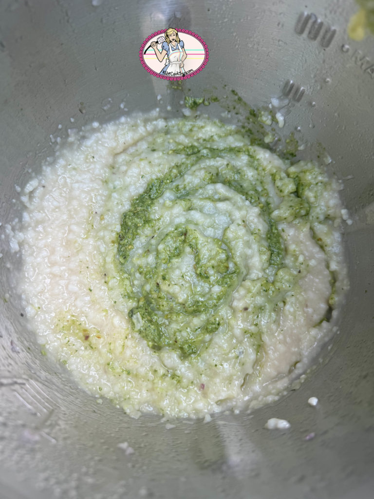 - Ajouter les 3 cuillers à soupe de pesto et le parmesan ou grana padano. Réserver au frais jusqu’au lendemain.