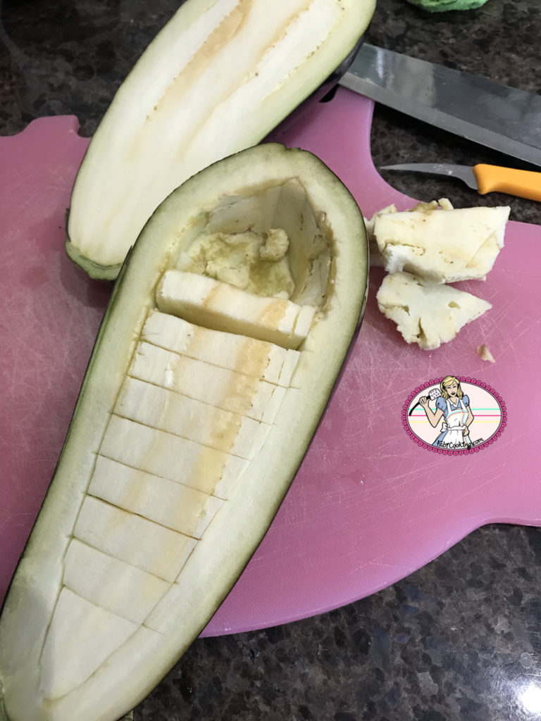 - A l’aide d’un couteau à lame fine, inciser la chair de l’aubergine en laissant un centimètre le long de la peau. Découper des tranches d’un centimètre environ et passer une cuiller à soupe sous cette découpe pour enlever l’intérieur de l’aubergine