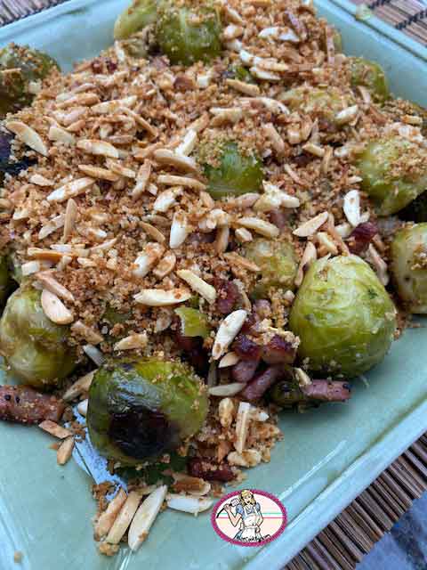 - Présenter les choux de Bruxelles recouverts du mélange chapelure et amandes et ajouter les quelques petits lardons.