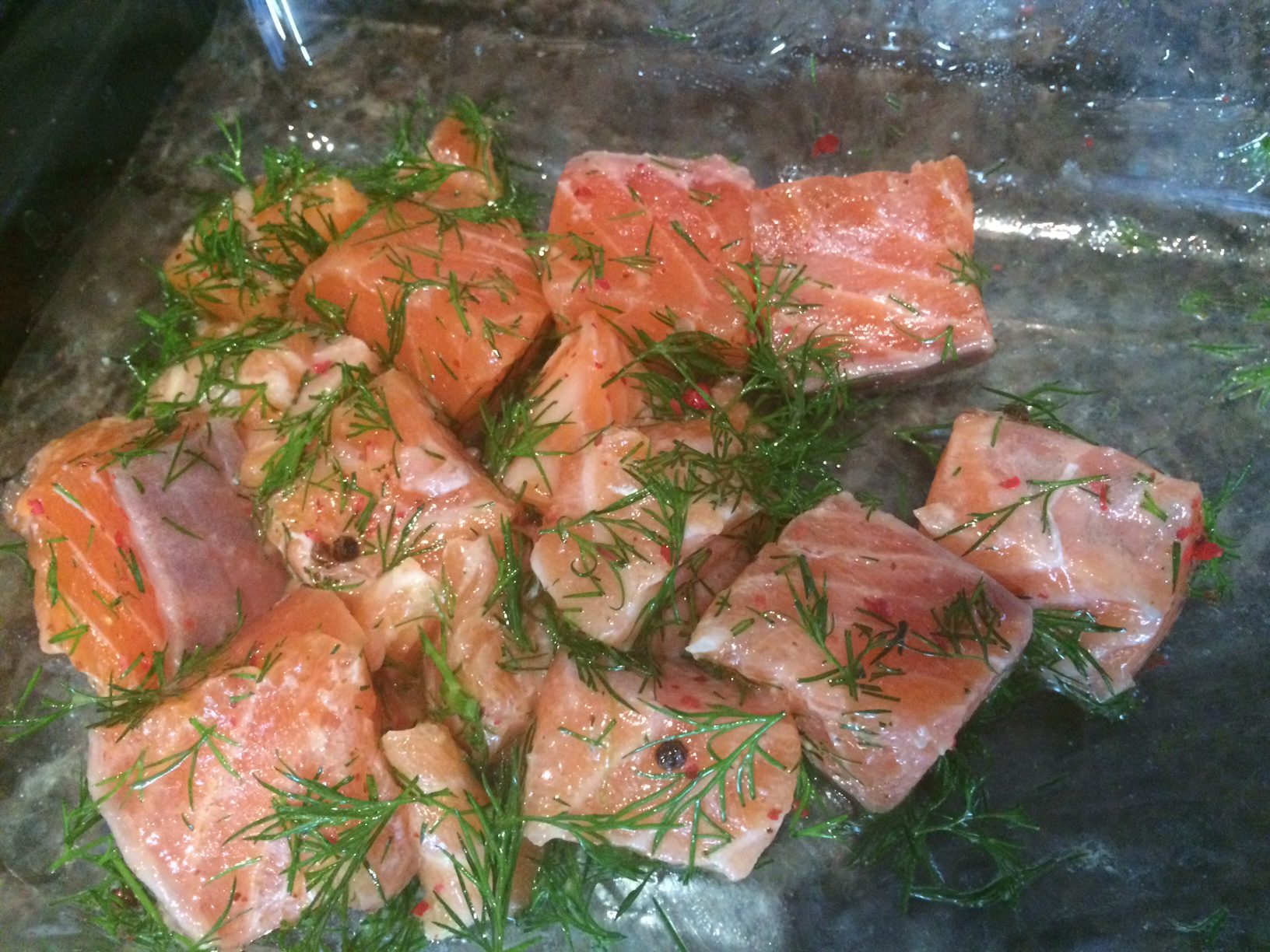 1. Deux heures à l’avance, faire mariner dans l’huile d’olive  le saumon coupé en gros dés avec le poivre rose écrasé grossièrement avec le dos d’une cuiller, le thym, le sel et le poivre blanc et la moitié de l’aneth ciselé. Couvrir d’un film alimentaire et placer au réfrigérateur.IMG_6555
