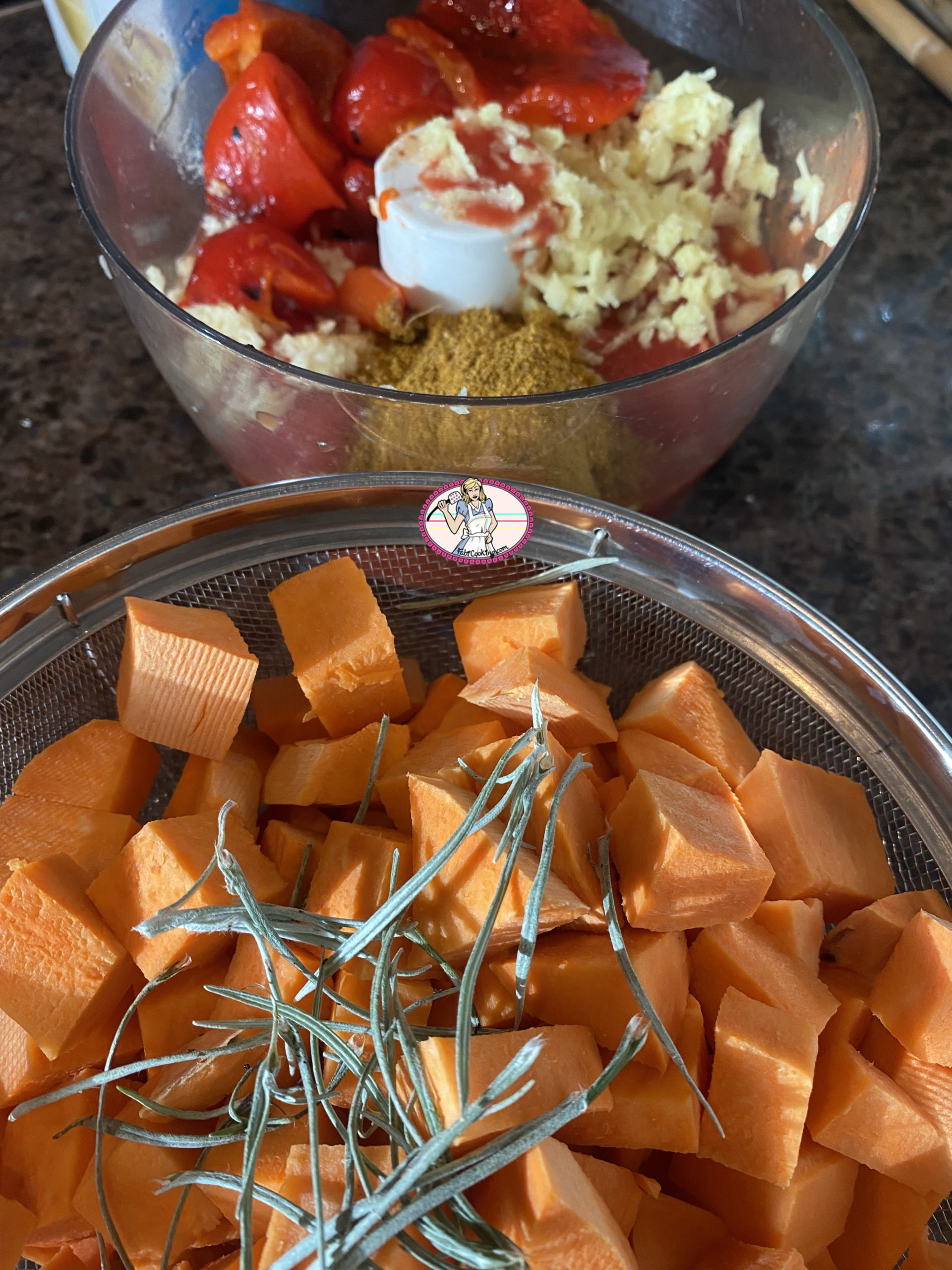 4. Placer dans la cuve du hachoir, la poudre de curry, le gingembre râpé, l’ail et la boîte de tomates pelées avec leur jus et le poivron grillé donner quelques pulsions. de façon à obtenir un mélange fin, un peu comme une soupe.