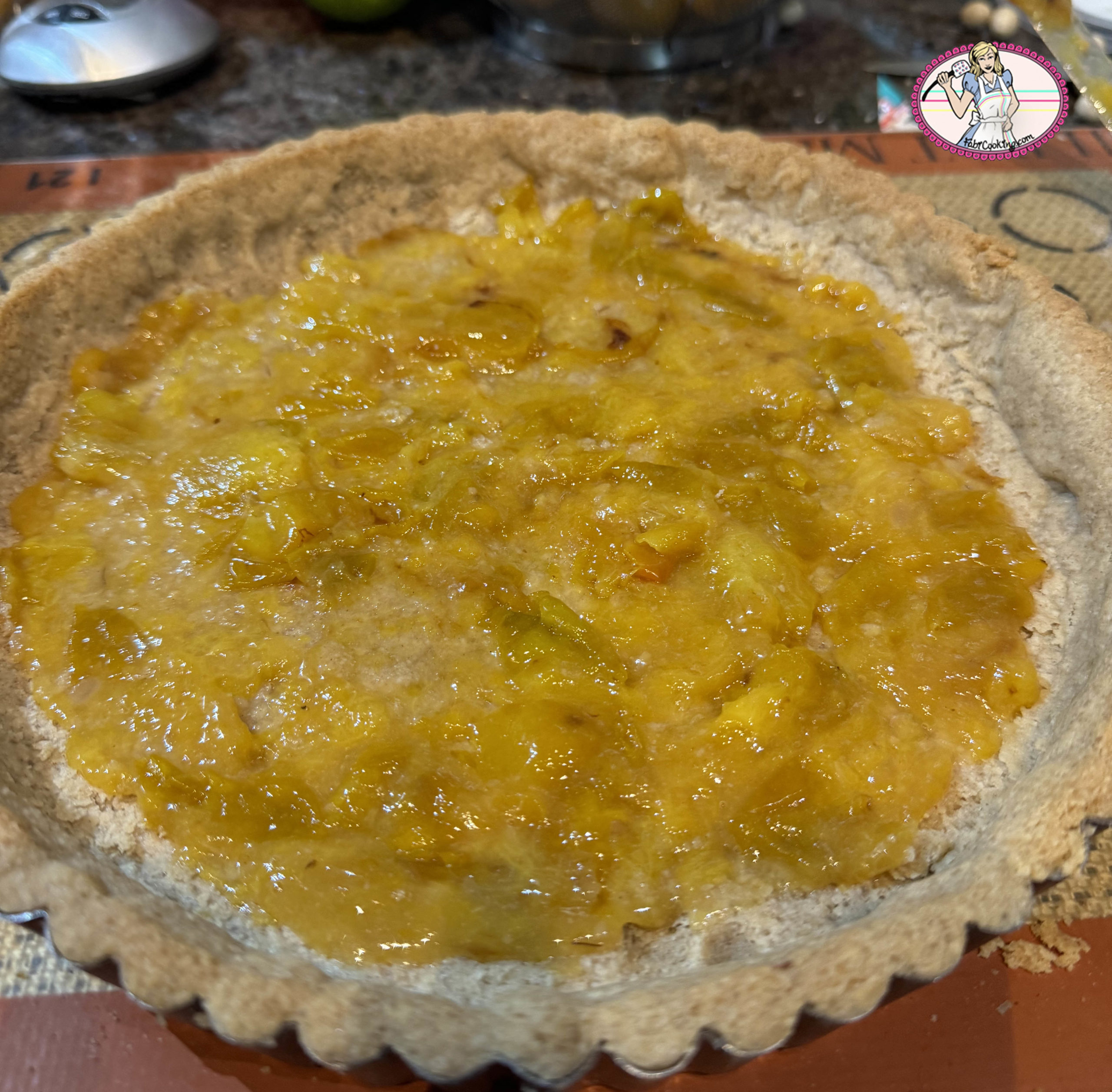- Au bout des cinq dernières minutes de cuisson, étaler la compotée de mirabelles sur le fond de tarte