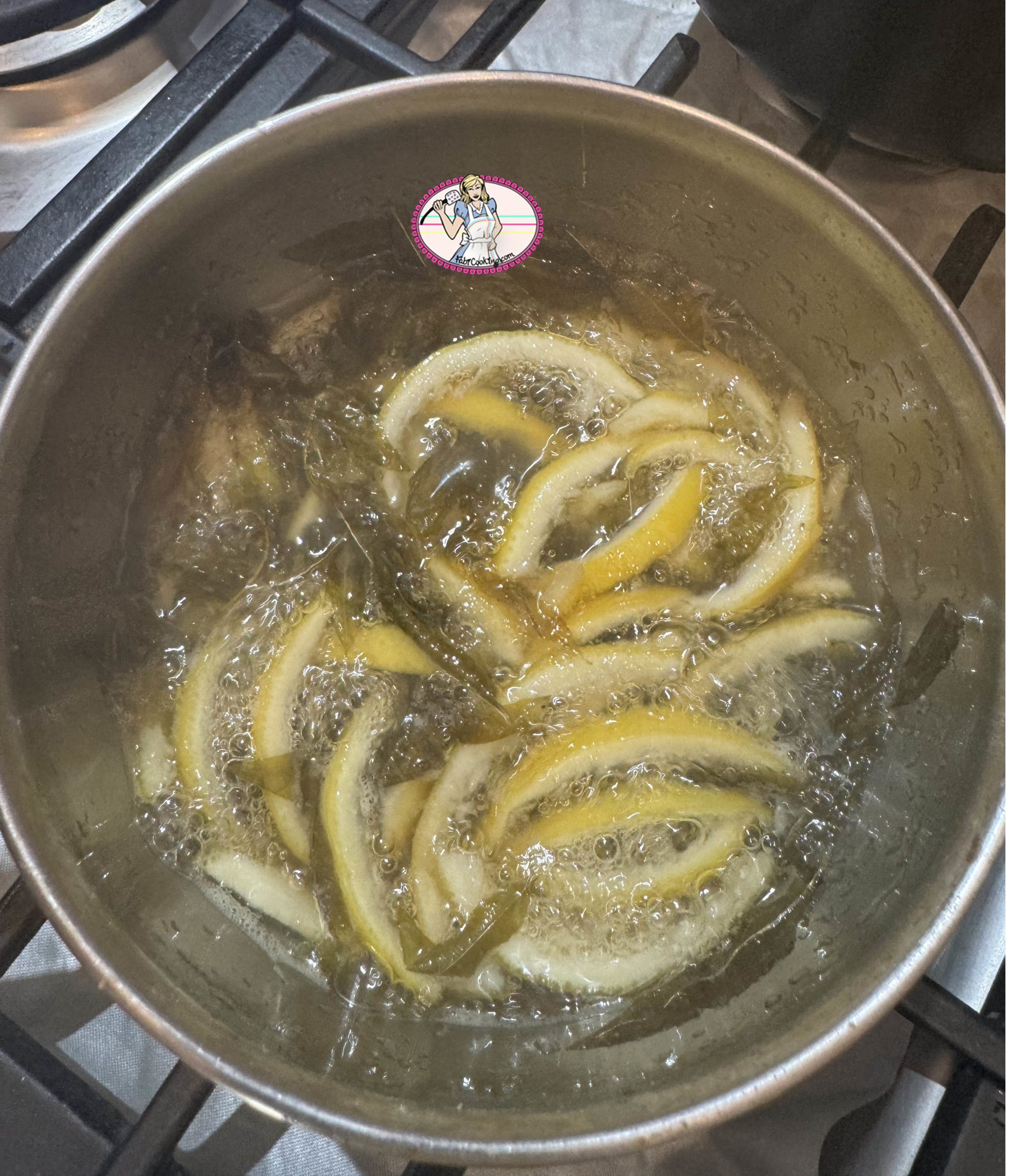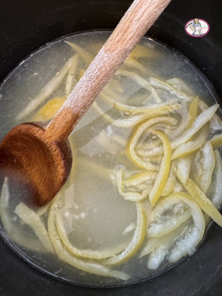 - Commencer par blanchir les écorces ( attention, avec un minimum de peau blanche!) ou zestes de citron jaune dans une casserole d’eau.
