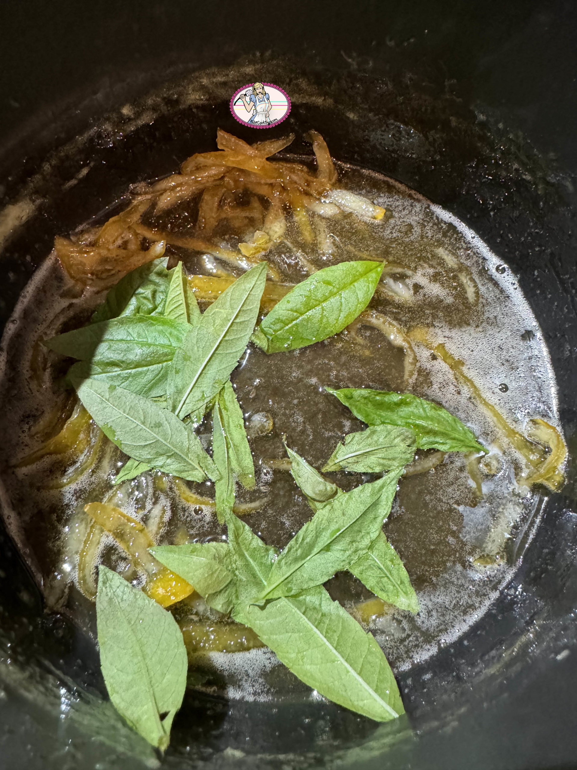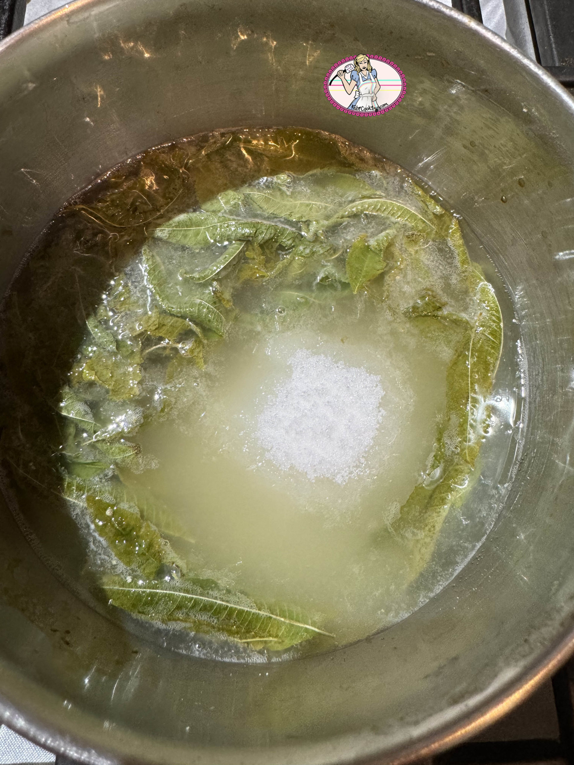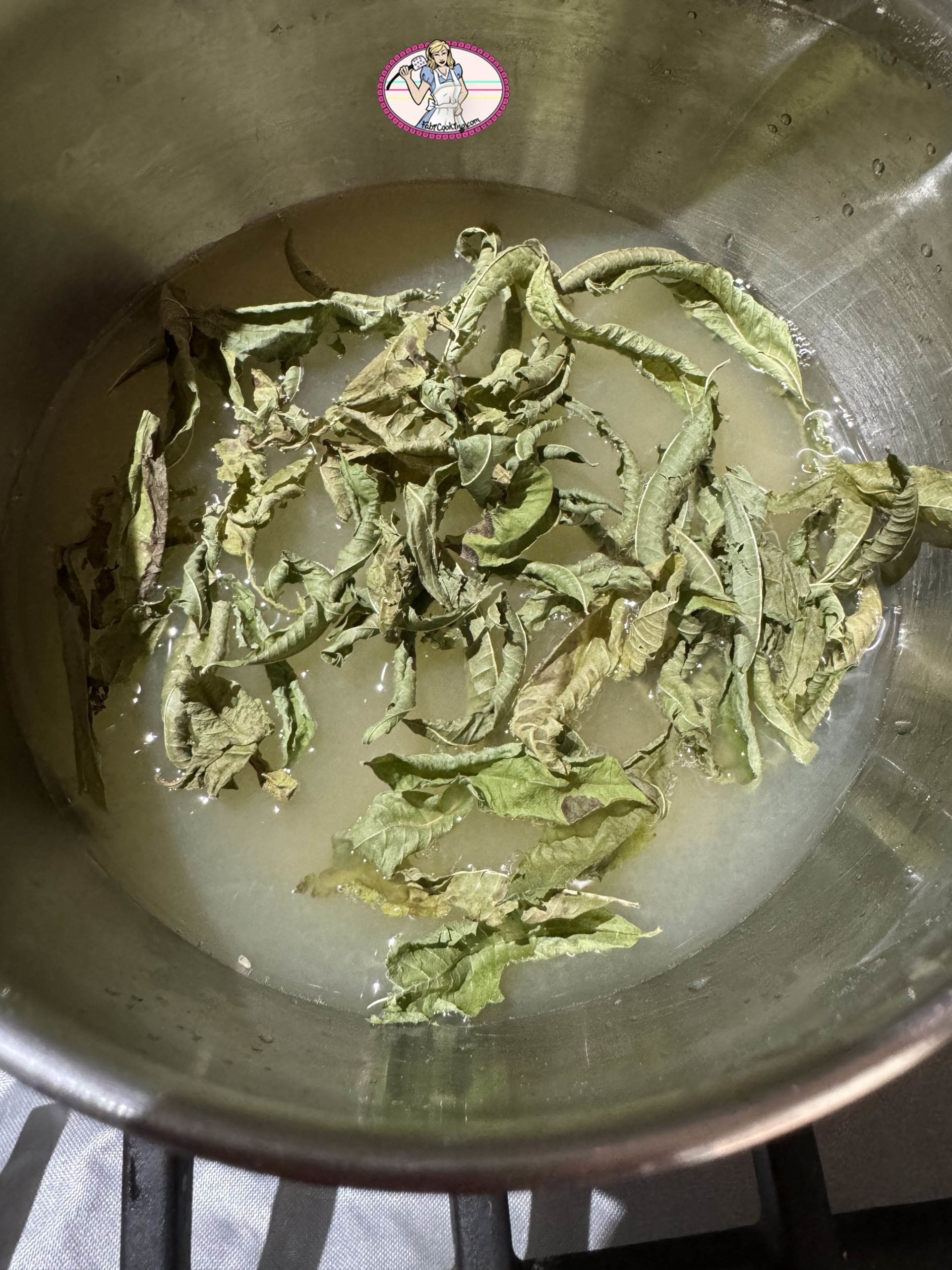 - Baisser sous la casserole, ajouter les feuilles de verveine sèches ( leur goût est un peu plus fort) et continuer pendant 10 mn.