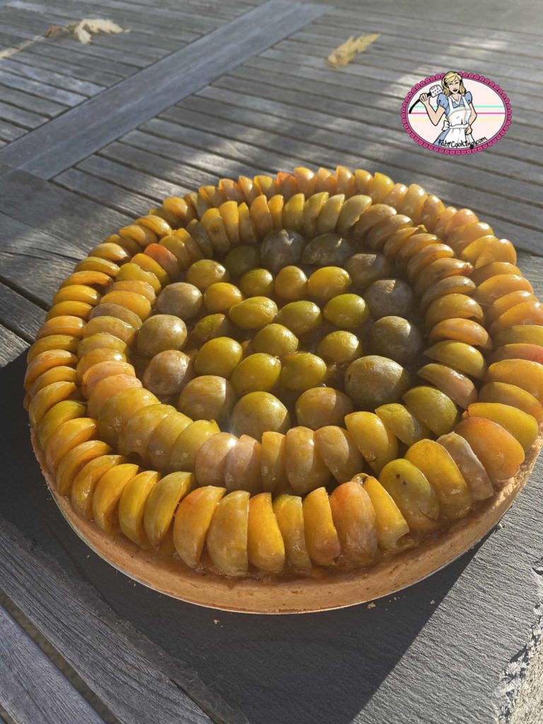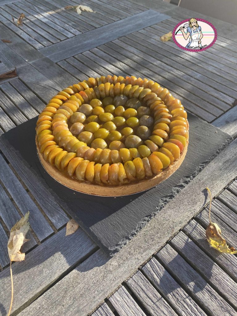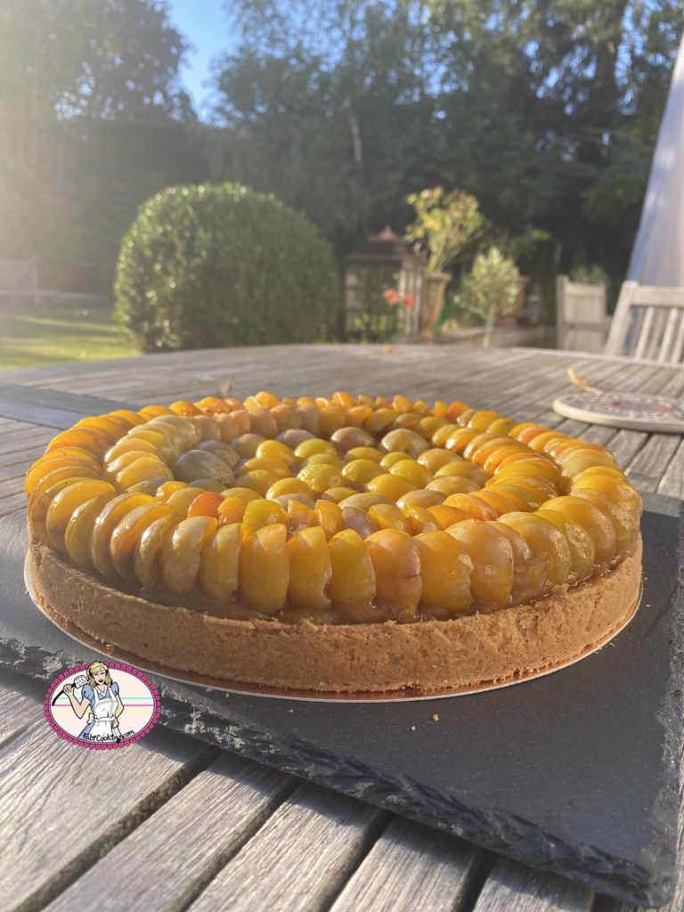 La pâte sablée noisette maison, croustillante et fondante à la fois, accueille une crème d’amande – ou de noisette- crémeuse et une compotée de mirabelles.