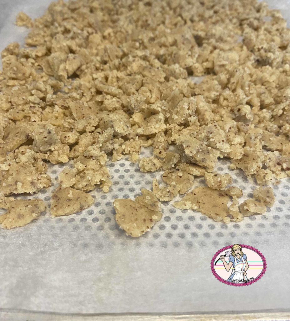 - Emietter grossièrement la pâte à crumble sur un tapis de silicone ou une feuille de papier sulfurisé avant de la mettre au four pour une cuisson à 180° pendant 12 à 15 mn.
