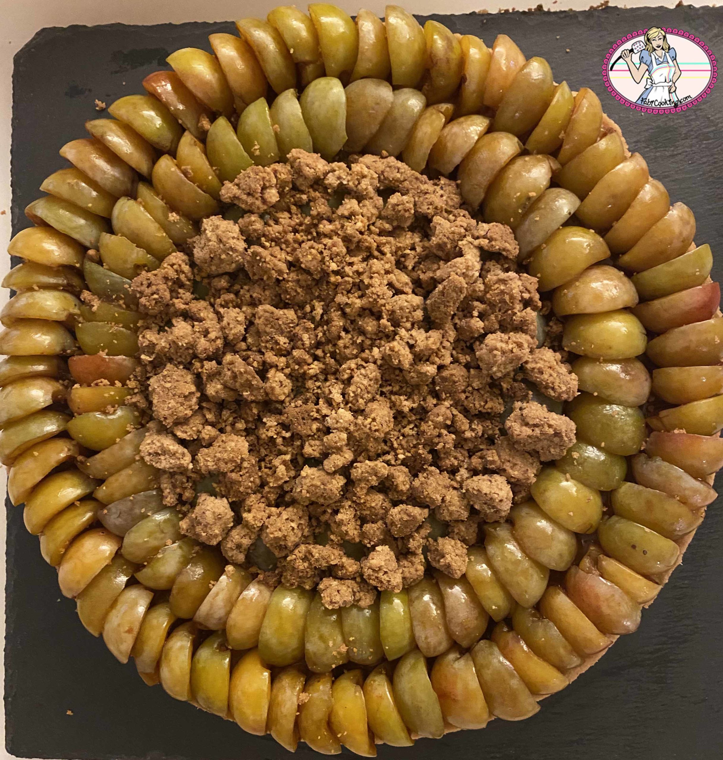 4. Avant de servir, garnir avec le crumble – qui est absolument DÉLICIEUX- le centre de la tarte: ce serait dommage d’en recouvrir toute la tarte car elle est BELLE!