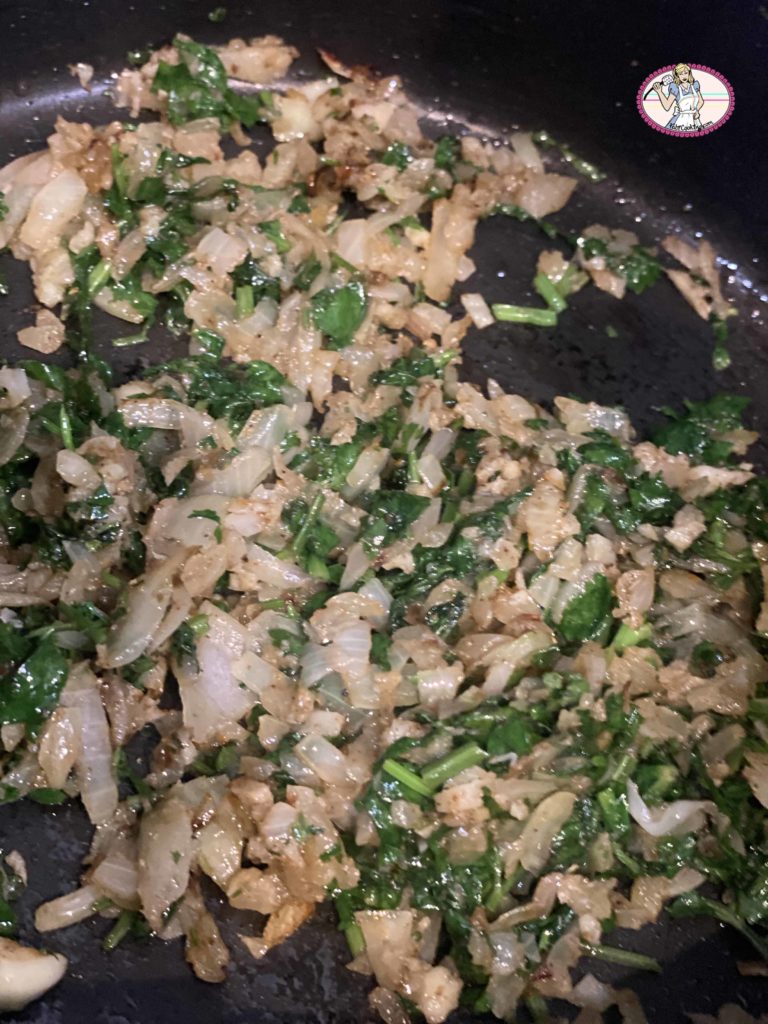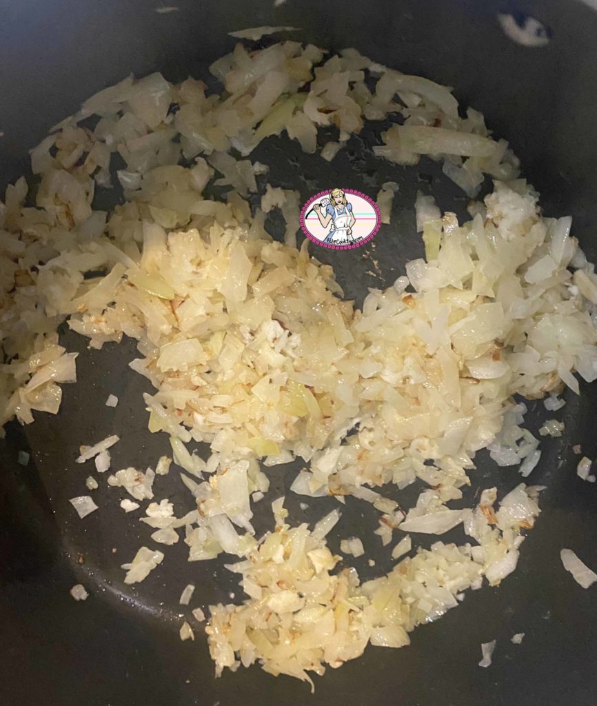 - Faire revenir les oignons dans 4 cuillers d’huile d’olive. Quand ils deviennent un peu translucides, ajouter l’ail écrasé au presse ail