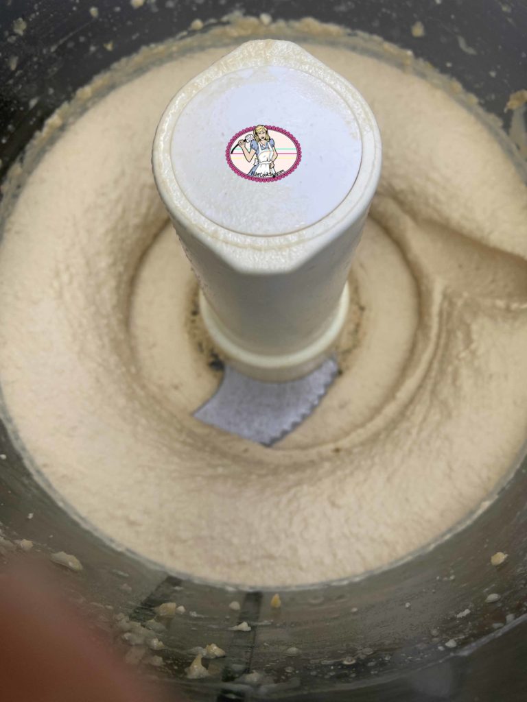 6. Dans votre robot à lame, placer les pois chiches avec l’ail, le sel, le cumin, le paprika fumé, jusqu’à obtenir une purée très lisse