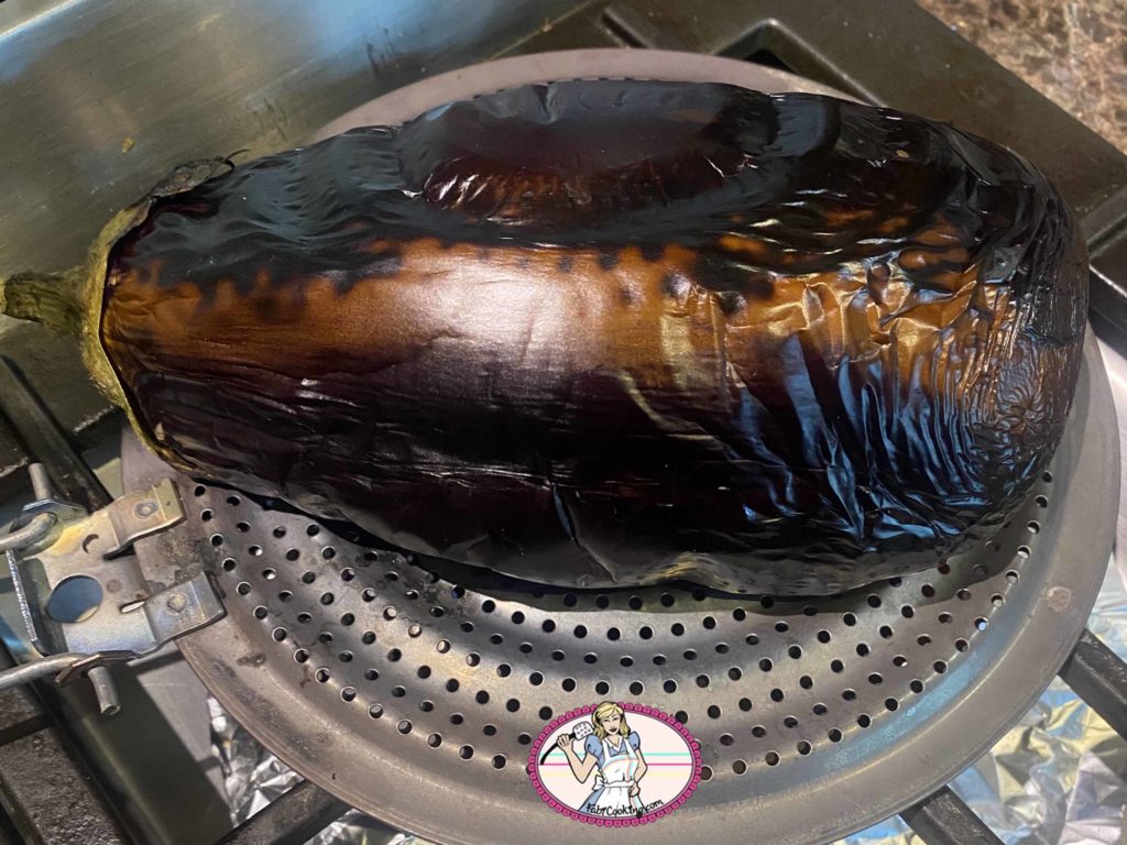 - Faire griller l’aubergine au four, au barbecue ou comme moi, tout simplement sur le bec à gaz. Quand elle devient bien molle, la retirer de sur le feu.