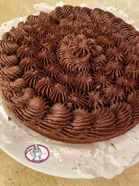 4. Garnir le dessus du premier gâteau, placer le second gâteau et glacer toute la surface ( côtés inclus). Dégustez!