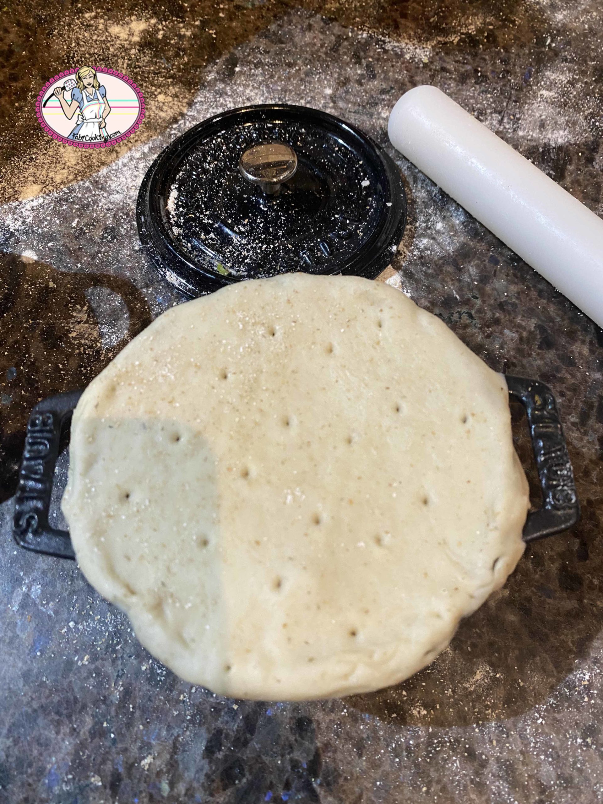 7. Découper à l’emporte pièce un cercle supérieur de 2 bons centimètres au moins du diamètre de la cassolette. Attention la pâte va se rétracter. Piquer à la fourchette la pâte et humidifier le contour de la cassolette pour que la pâte adhère facilement. Luter.