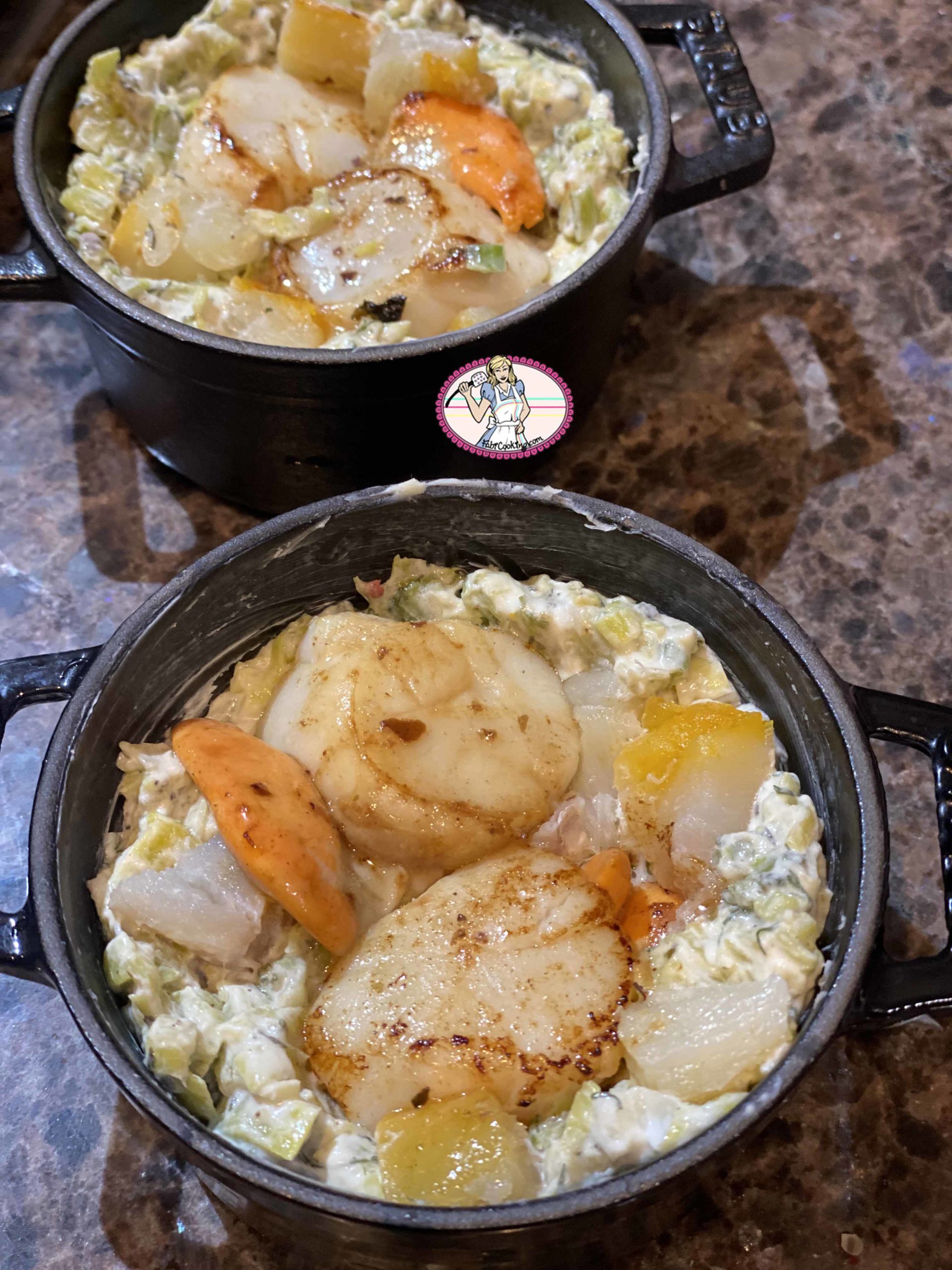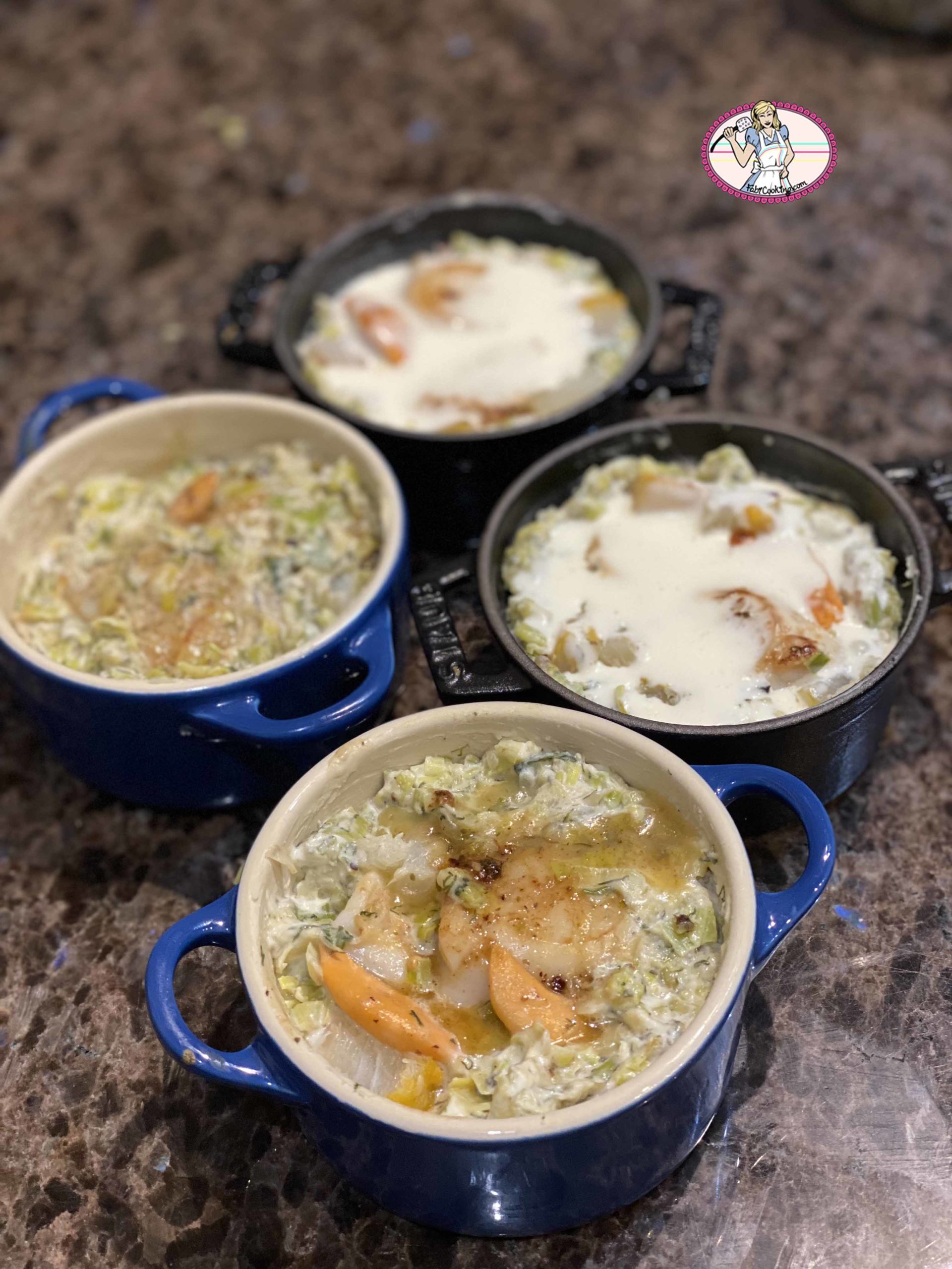 En effet, je fais confire les poireaux pendant quelques minutes avant d’ajouter la crème fraiche et de garnir mes cassolettes. Quant aux coquilles St Jacques, je les snacke en aller- retour dans la poêle pour les colorer. Vu la taille des cassolettes, je n’y ai mis que 2 belles St Jacques ( plus quelques dés de haddock fumé qui me restaient de ma précédente recette), et franchement, en plat unique cela nous était plus que suffisant! Si vous le souhaitez, quelques moules pourraient s’inviter à la fête. Vous end avez de toutes préparées chez Picard ou autre.