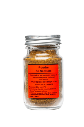 - Épices: ail des ours, poivre, cocktail d’algues, Poudre de Neptune Aneth, fenouil, badiane, algues,*sésame, épices