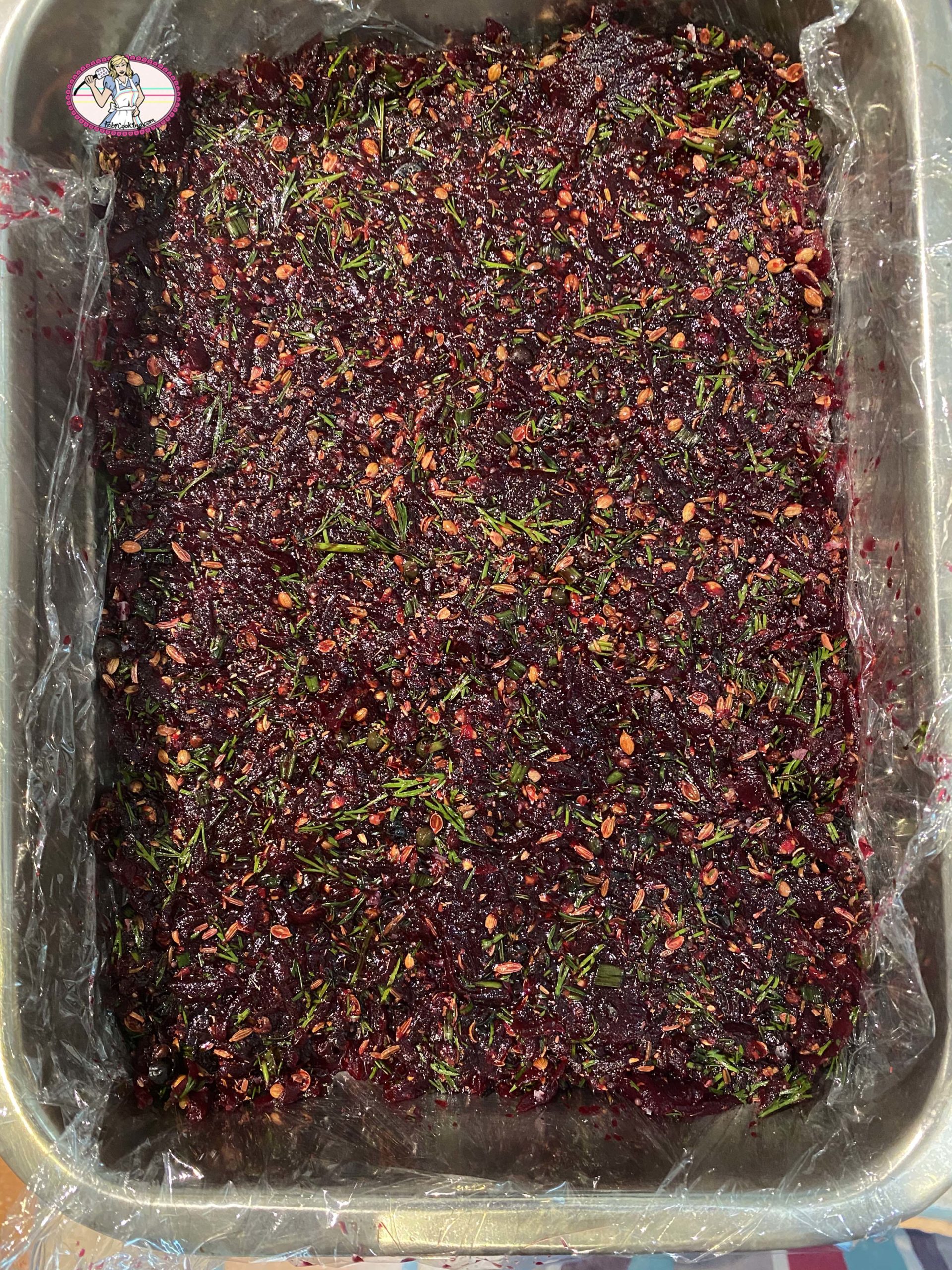 7. Ajouter la préparation aux épices sur le mélange betterave et herbes, verser les alcools et tapisser le fond du plat.