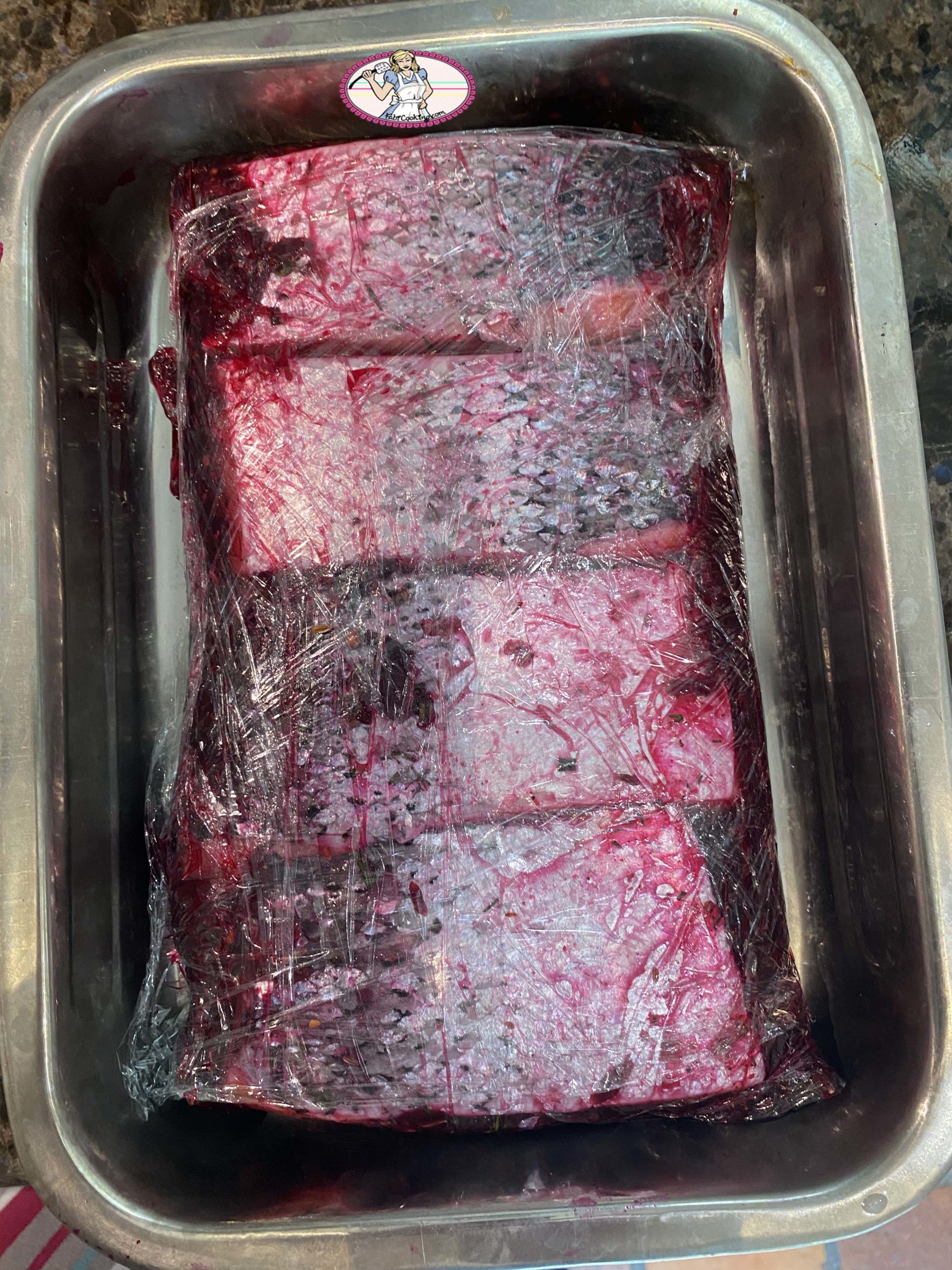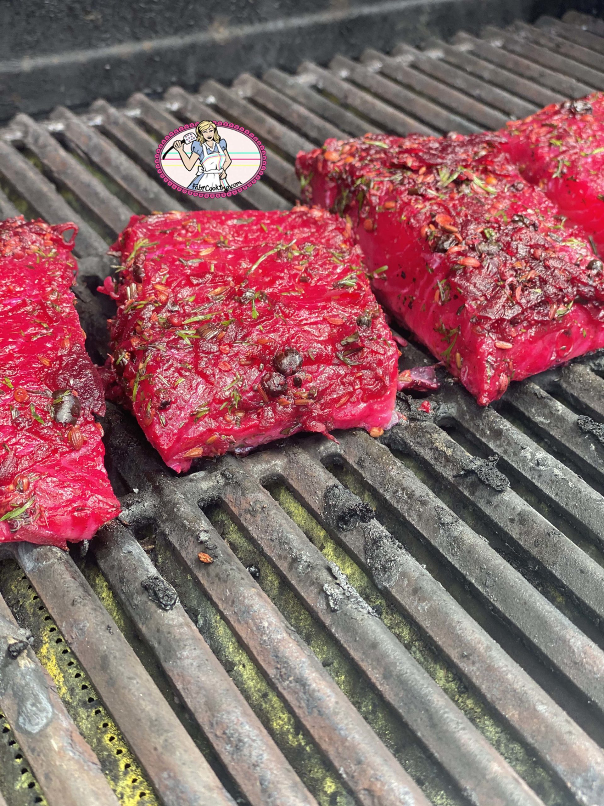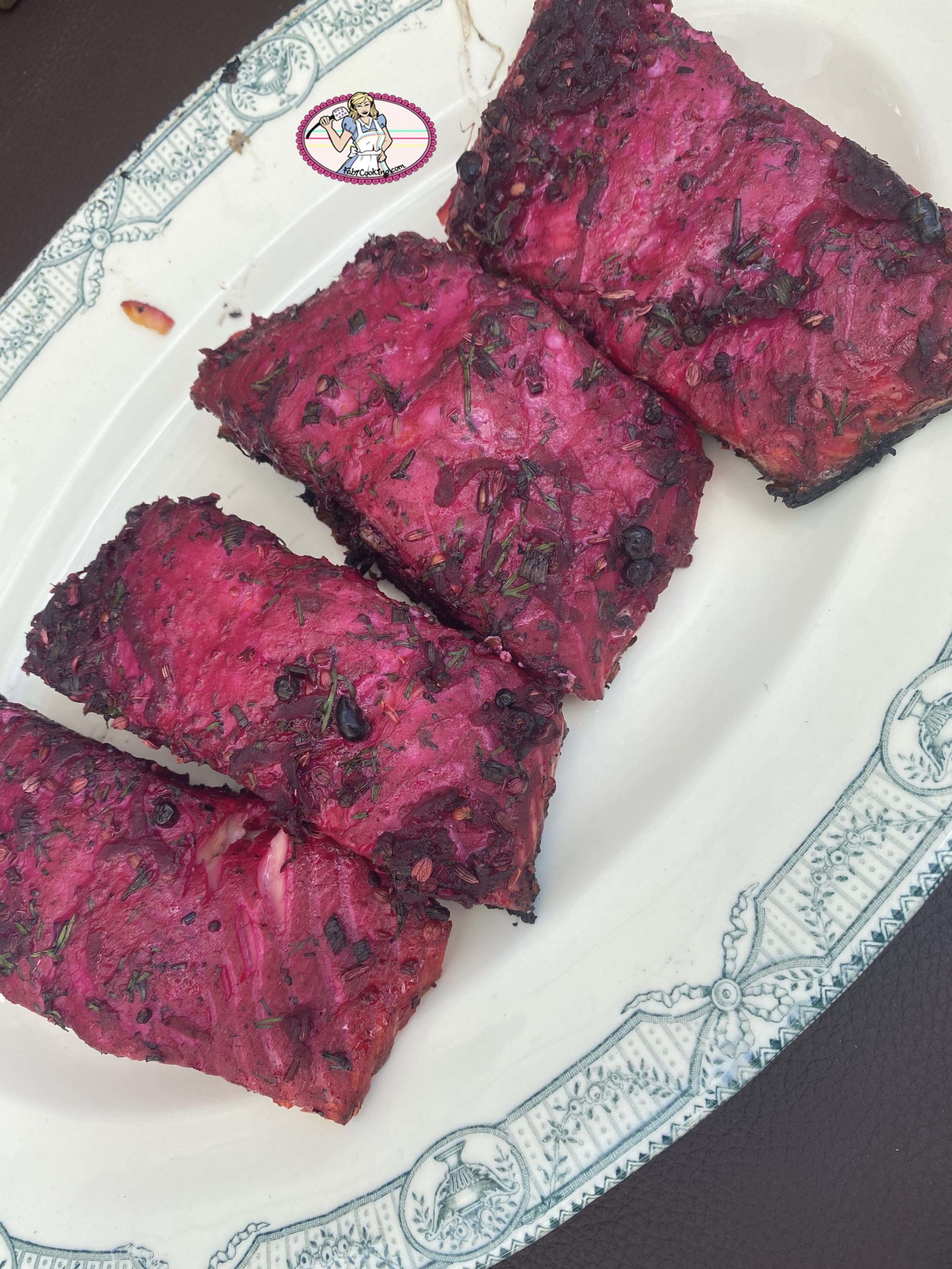 9. Le lendemain ou au minimum 3 heures plus tard, démailloter les pavés de saumon, ôter l’excédent de betterave et d’épices et faire griller au barbecue sur peau ou griller au four ou à la poêle. La cuisson sera de 10 à 12 minutes selon votre cuisson préférée: rose ou bien cuit. Ce saumon est incroyablement moelleux et quelque soit le mode de cuisson ne sera pas sec.