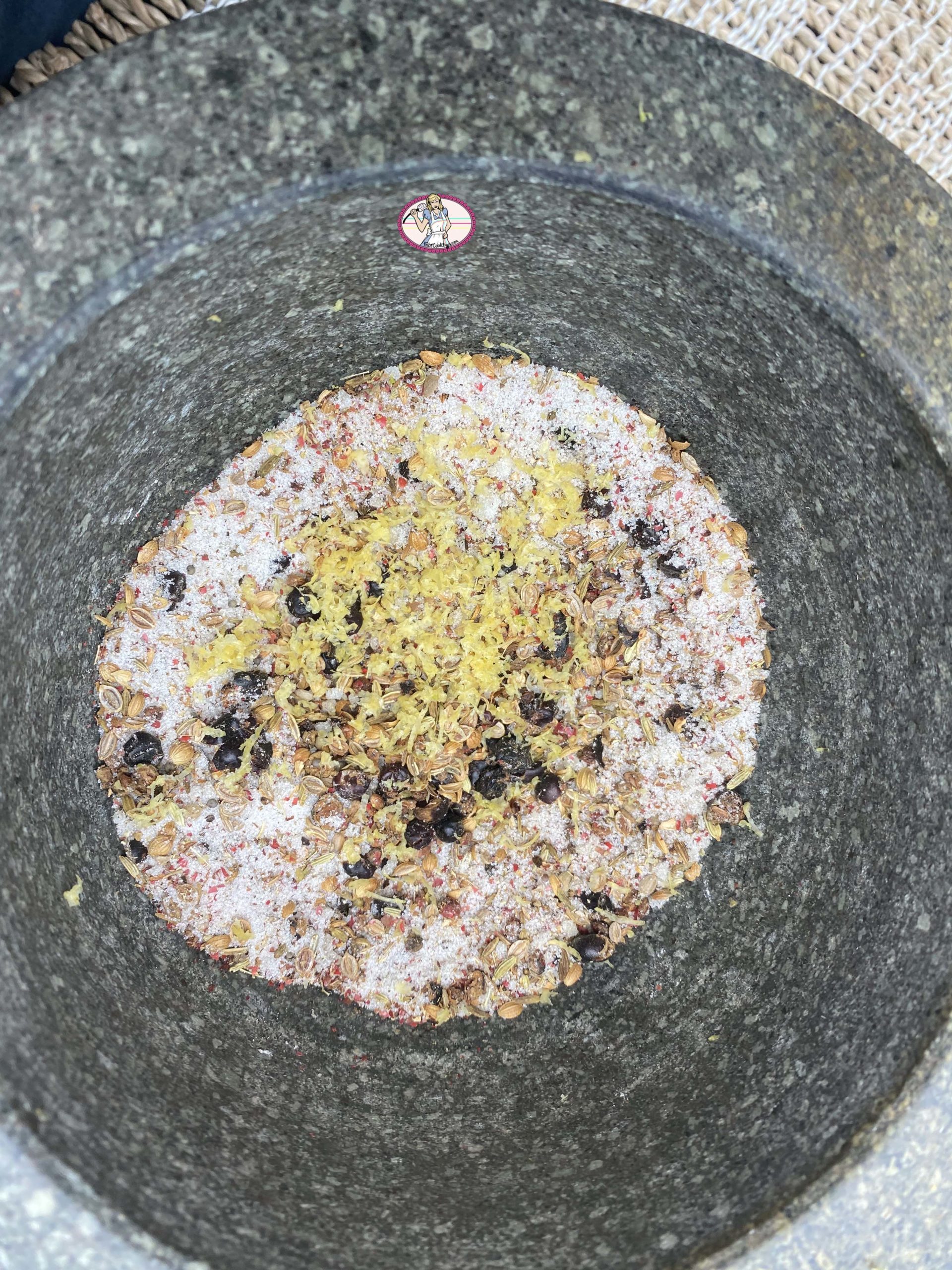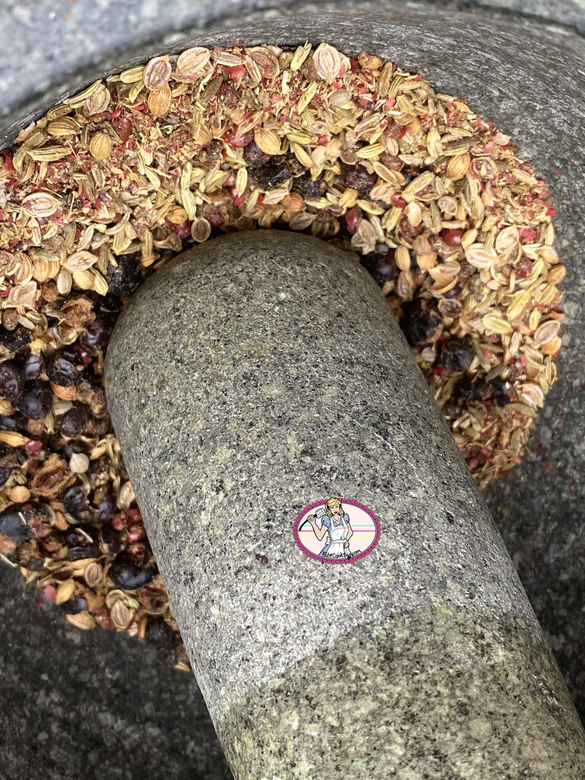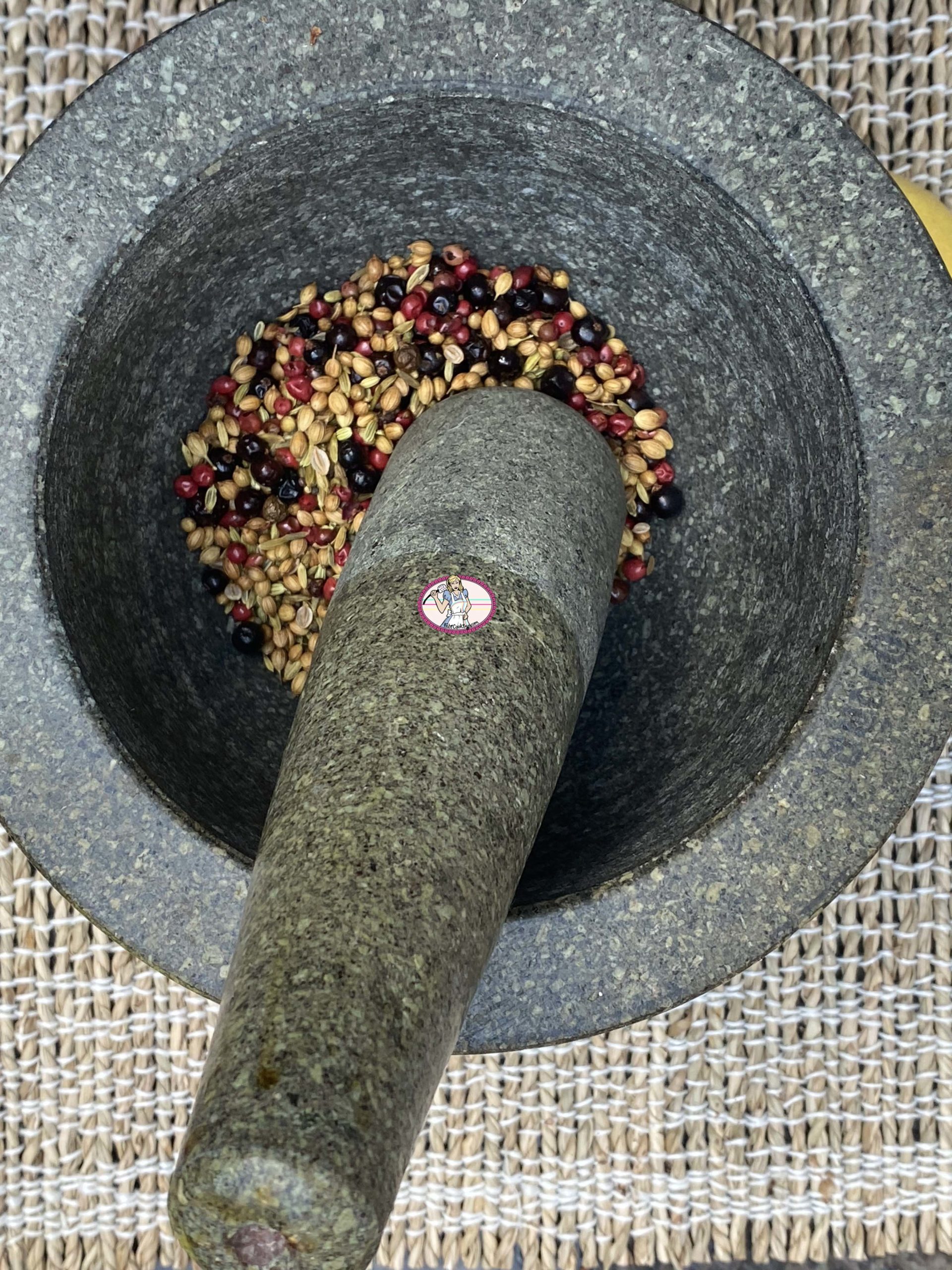 - Commencer à préparer toutes les épices sauf le poivre vert s’il est en saumure. Placer le tout dans une poêle pour les torréfier. Une fois revenues à température, les placer dans un mortier avec le poivre vert.