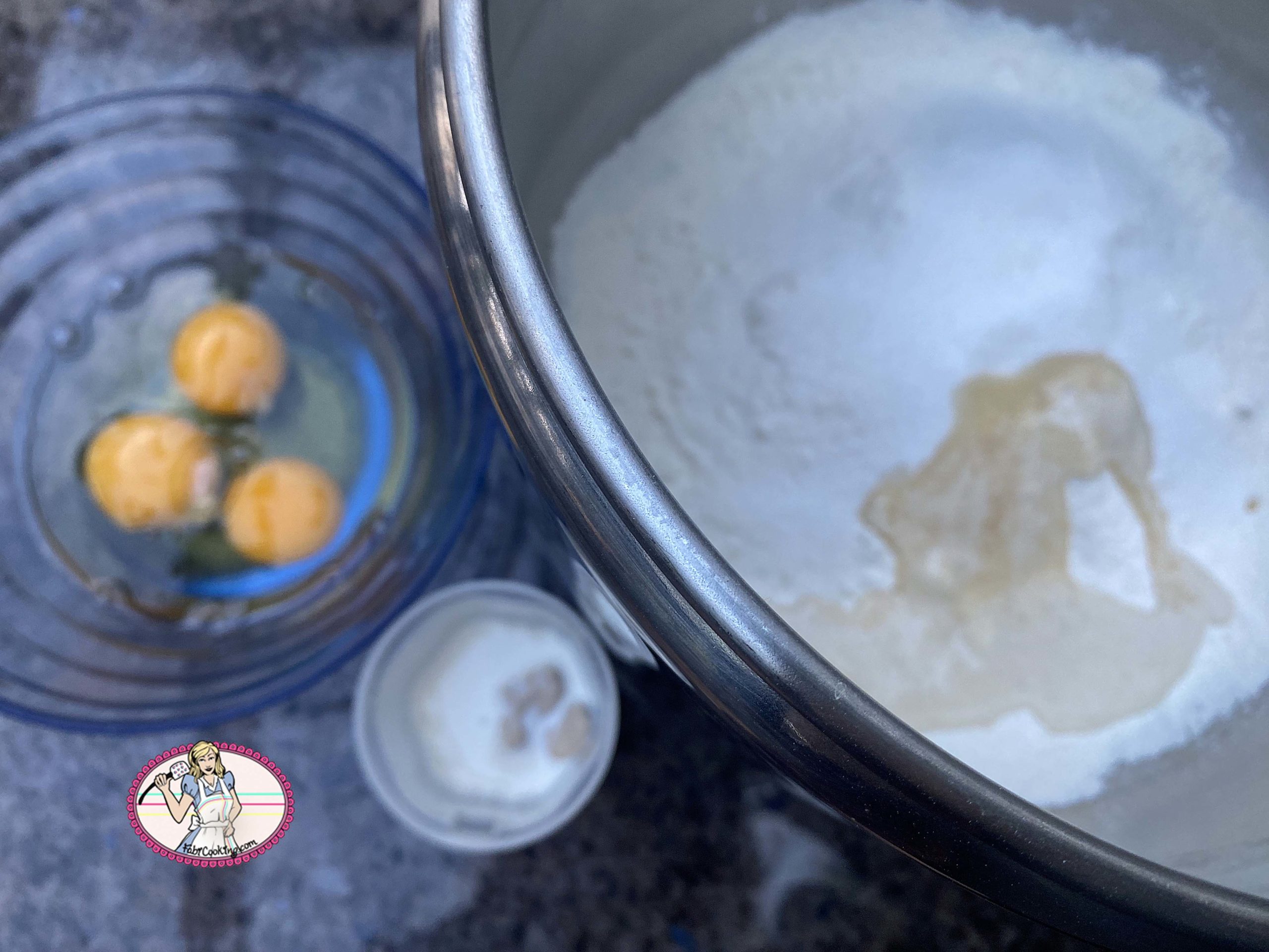 2. Dans la cuve du robot équipé de la feuille ( moi je prépare généralement mes pâtes dans mon superbe robot Ankarsrum -je vous conseille vivement d’aller jeter un oeil sur leur site- placer la farine, le levain, la levure diluée dans deux cuillers à soupe de lait tiède et commencer à pétrir.