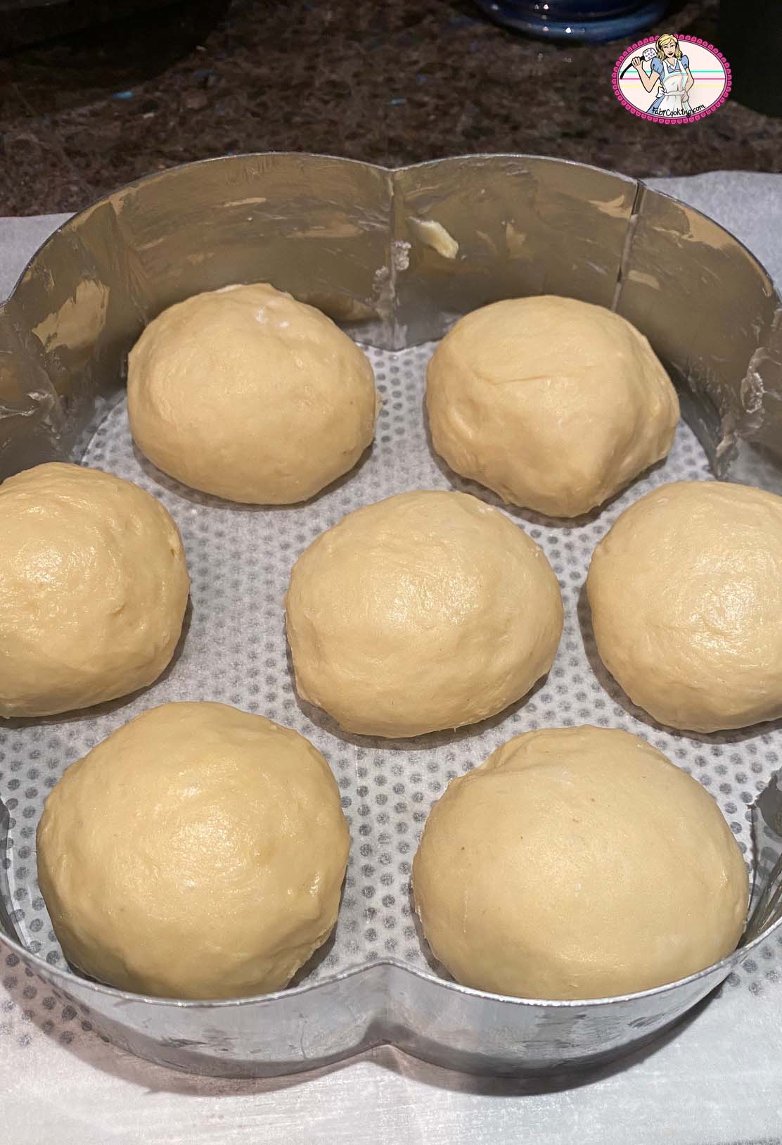 7. Débiter en pâtons de poids égal que vous roulerez avec la paume de la main pour en faire des boules. Si vous utilisez un cercle à mousse comme moi, veillez à le beurrer car la dorure peut adhérer aux parois et gêner le démoulage.