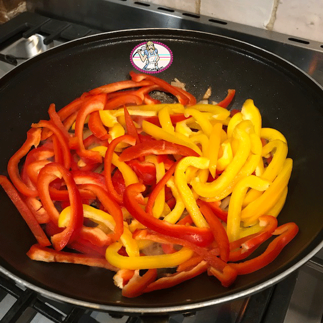 - Ajouter les poivrons émincés, faire confire quelques minutes puis ajouter les tomates concassées et continuer la cuisson à petits frémissements
