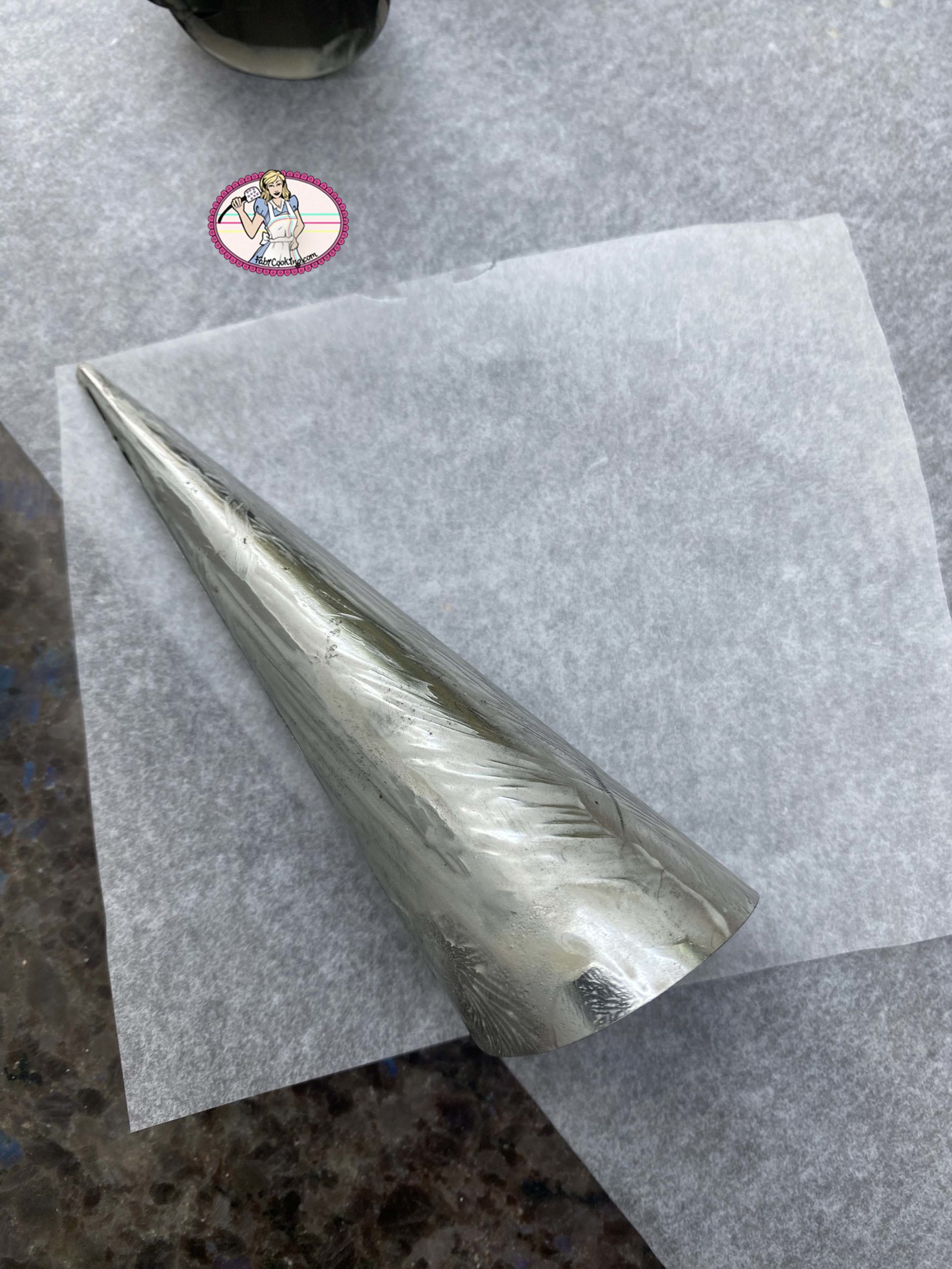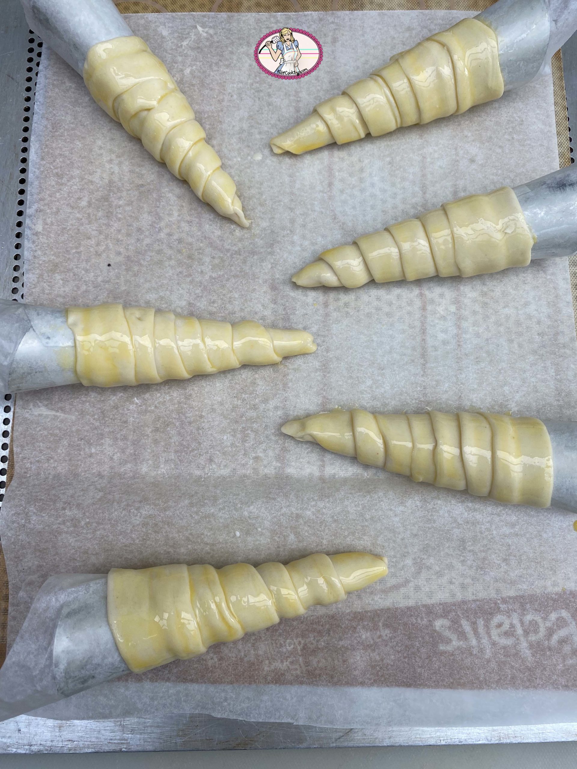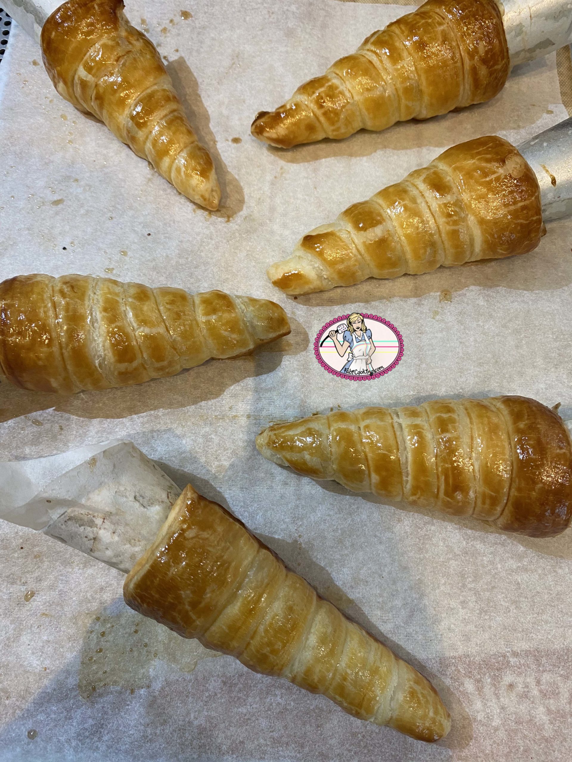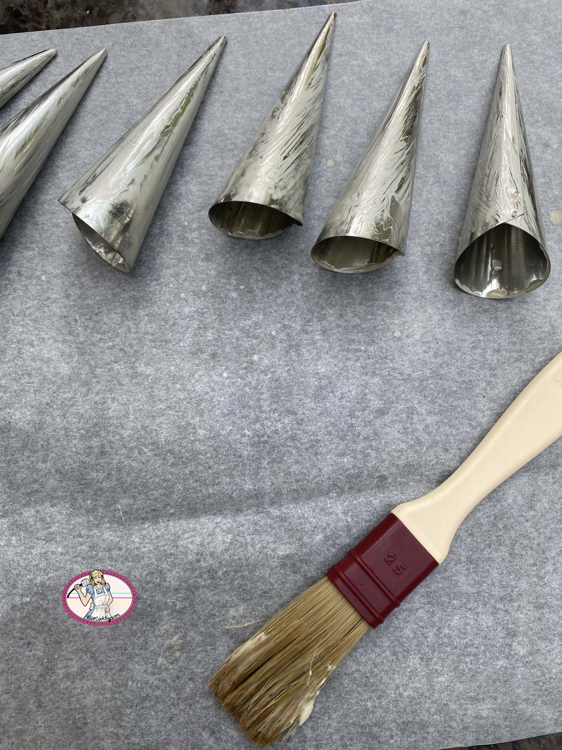 - Couper des carrés de 10 cm environ dans le papier sulfurisé et rouler en cône. Si vous avez des cônes métalliques, beurrez- les puis enrouler le papier sulfurisé tout autour. Sinon, confectionner un cône avec une double couche de papier aluminium. Dorer au pinceau avec un jaune d’oeuf et la cuiller à café de lait. Cuire entre 15 à 20 mn.