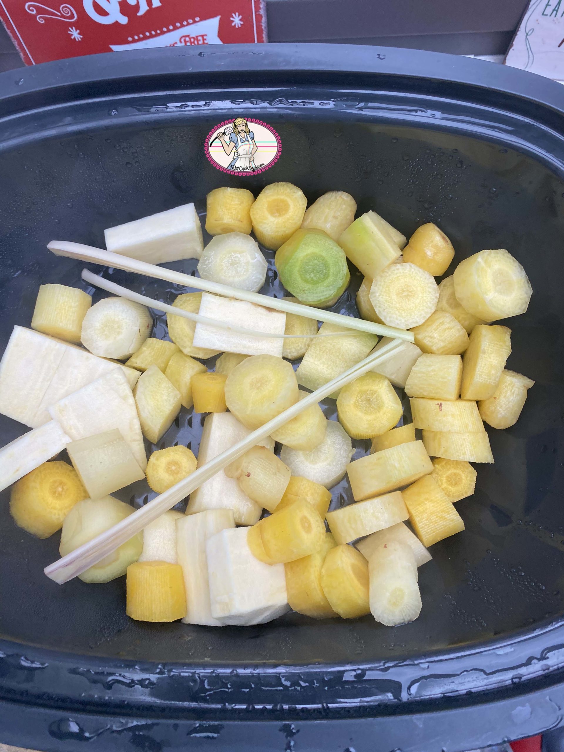 - Cuire à la vapeur ou dans une casserole avec une branche de citronnelle jusqu’à ce que carottes et patate douce soient bien cuites. Égoutter en gardant un petit verre d’eau de cuisson..
