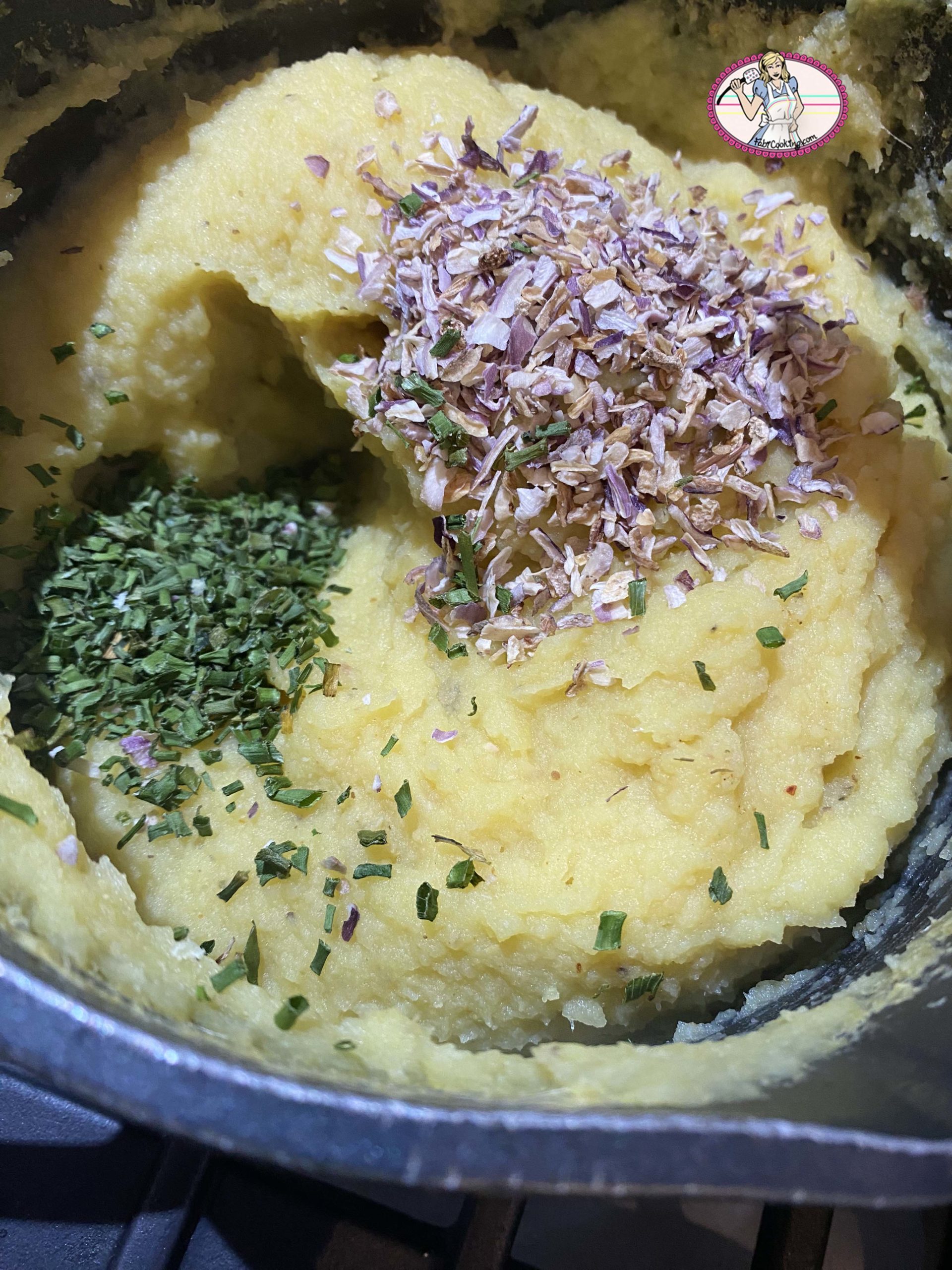 4. Quand la purée épaissit, ajouter échalote et ciboulette déshydratés et ôter du feu.