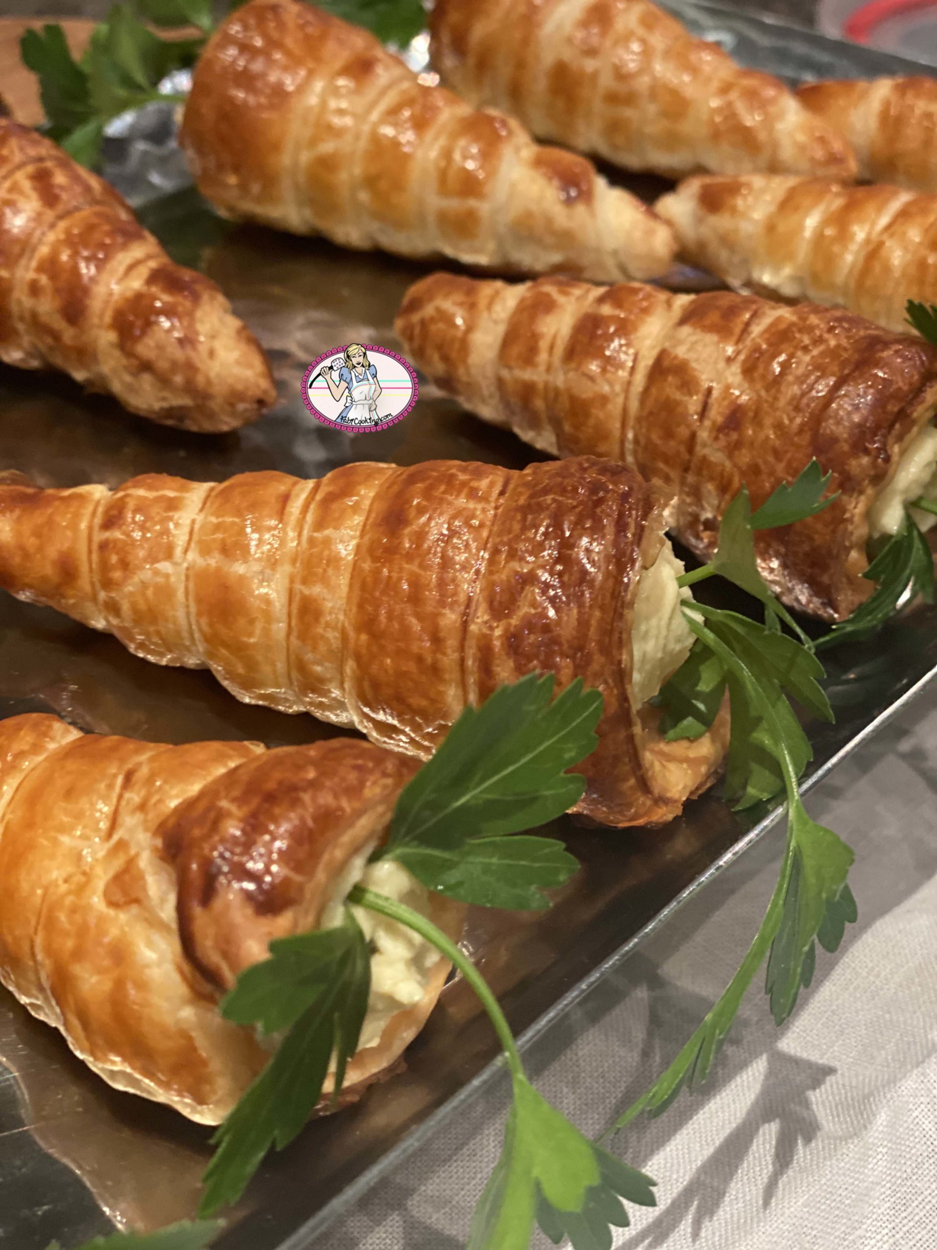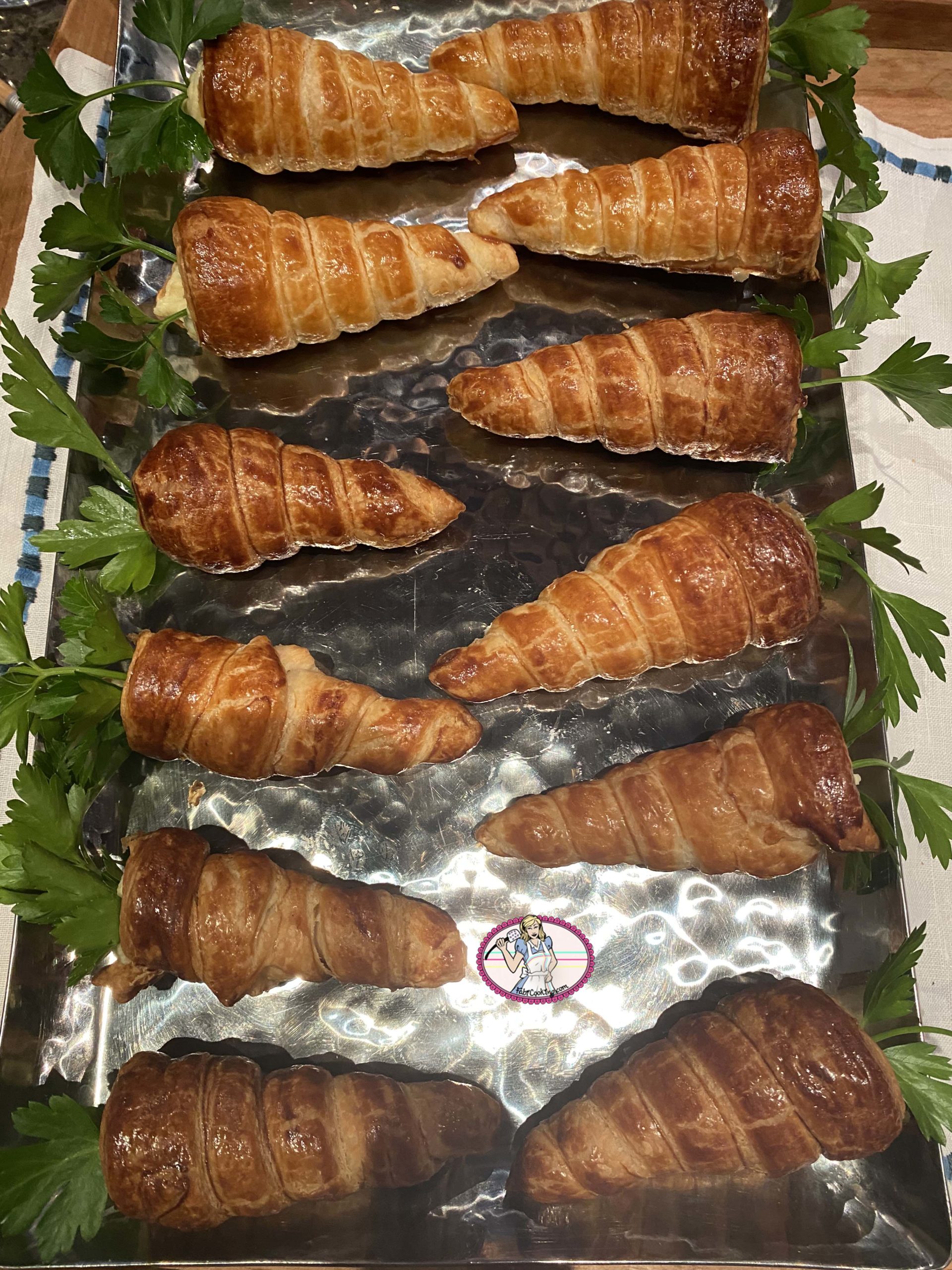 6. Pour Pâques, ma présentation en cornets feuilletés est très mignonne! . Veiller à étaler un peu plus finement votre pâte feuilletée pour que les cornets ne soient pas très épais. Si cela vous semble compliqué, il suffira de garnir très généreusement le cornets. Décorer avec un brin de persil.
