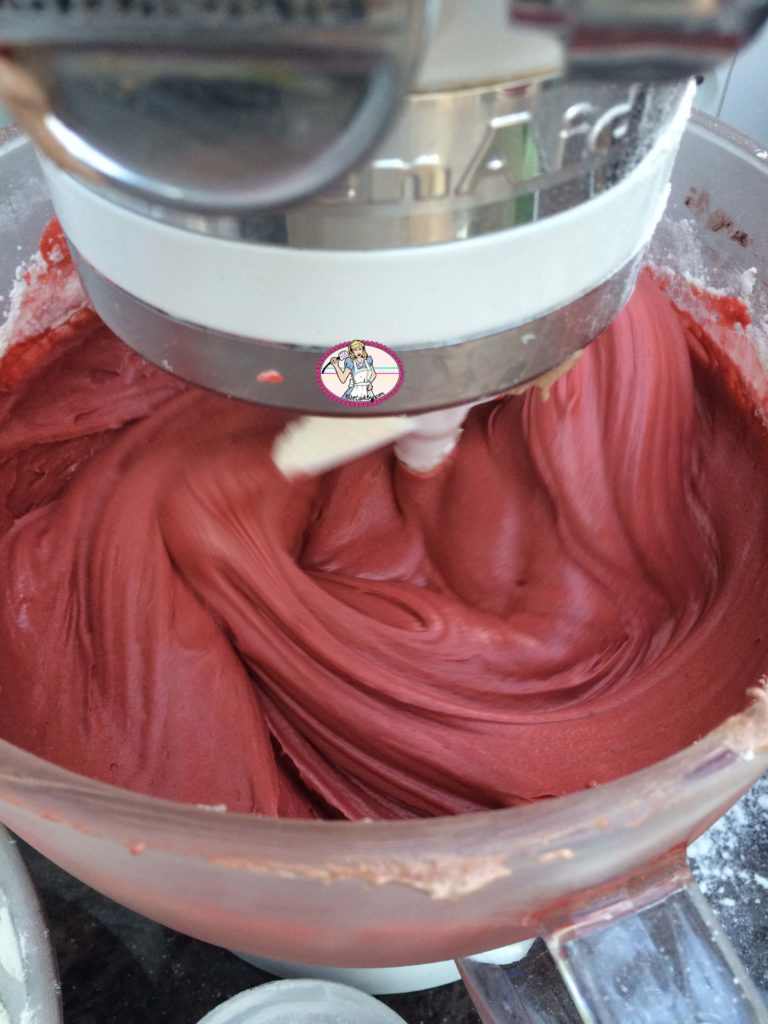 - Dans un verre doseur, mélanger le lait Ribot( buttermilk) avec le colorant rouge . Si vous n’avez pas de lait Ribot, contentez vous de verser le jus d’un demi citron dans la quantité de lait nécéssaire et laisser reposer 20 mn.