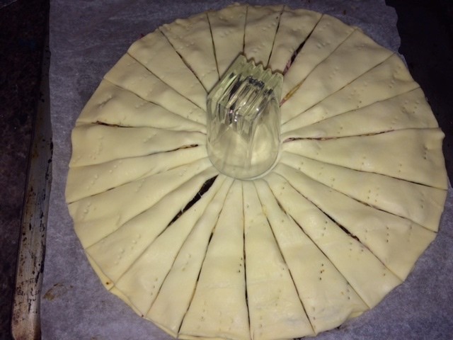 Moi, je les aime ces tartes soleil parce que je les trouve vraiment pratiques: chacun tire son rayon de pâte feuilletée fourrée de bonnes choses sans que la maitresse de maison ne s’occupe du service! Moi, le service, ça me… barbe. Hé oui, c’est dit!