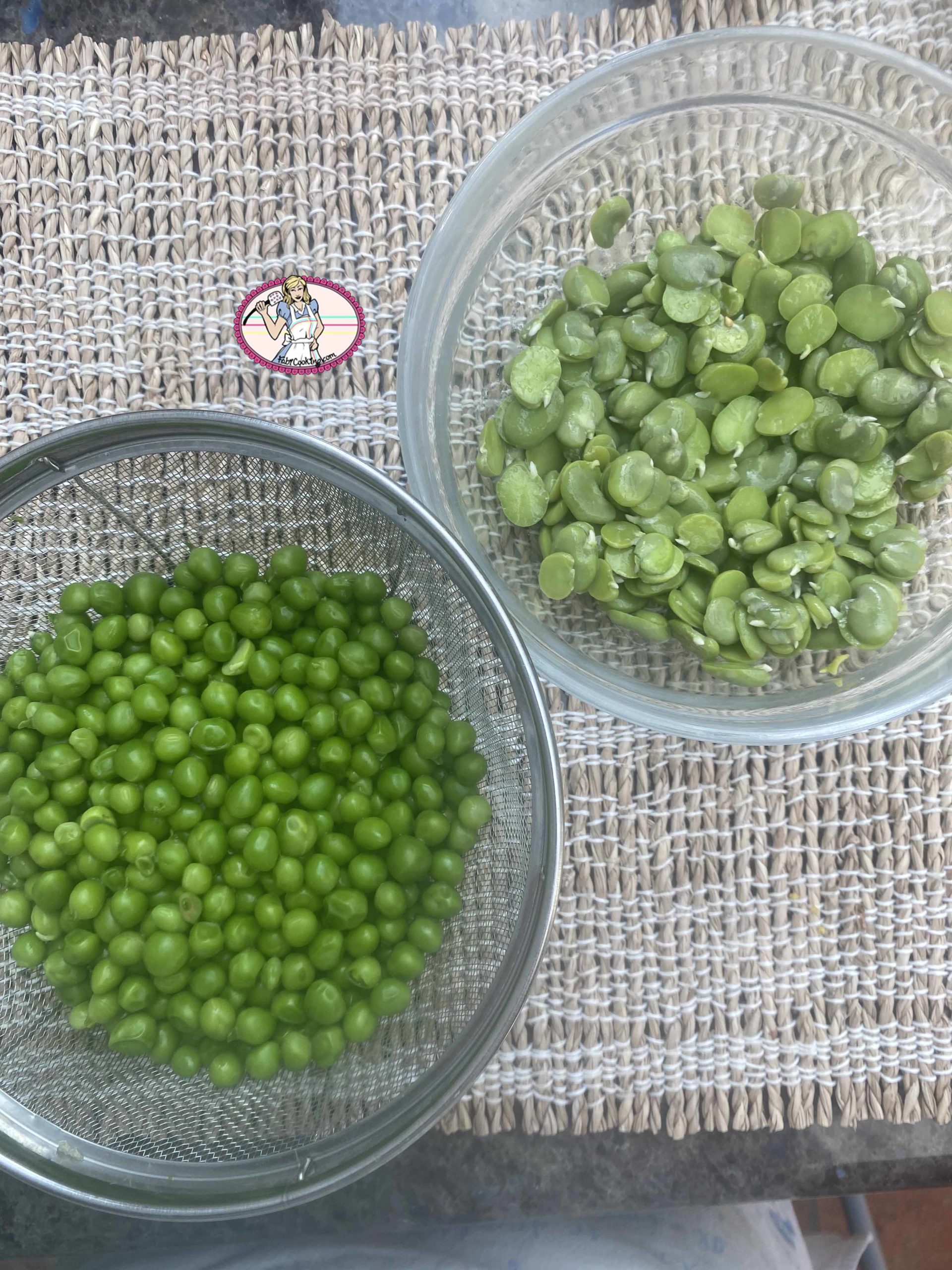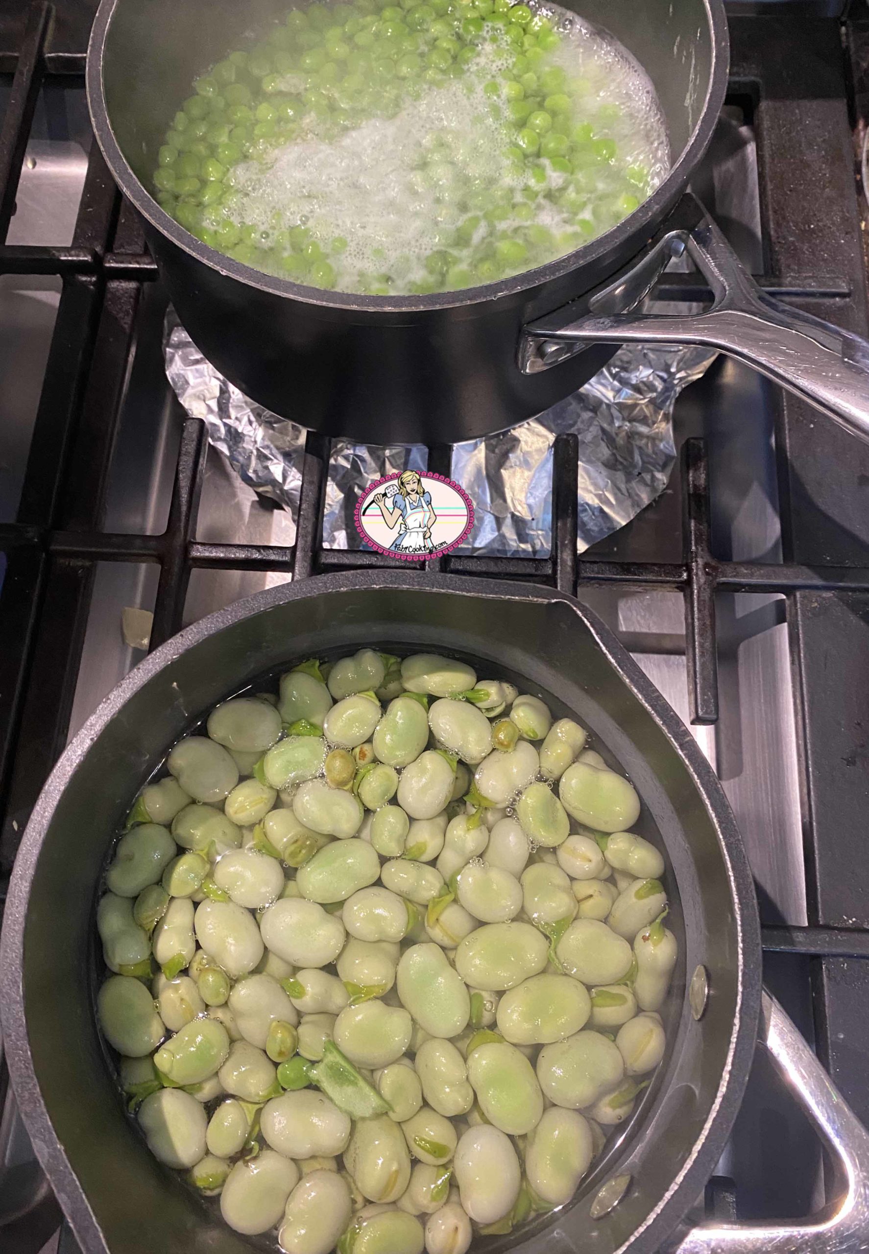 - Faire bouillir une grande quantité d’eau salée pour deux casseroles et plonger les petits pois dans l’une et les fèves dans l’autre de préférence. Vous pourriez aussi tout cuire dans la même casserole mais je ne voulais pas risquer d’avoir des cuissons inégales.