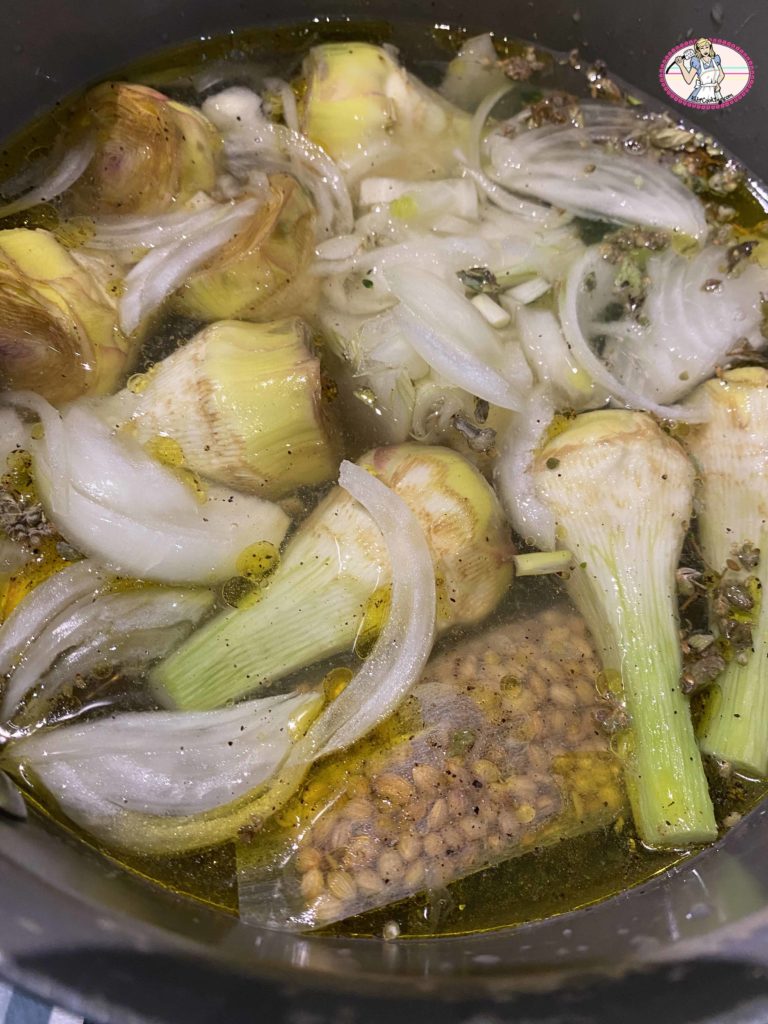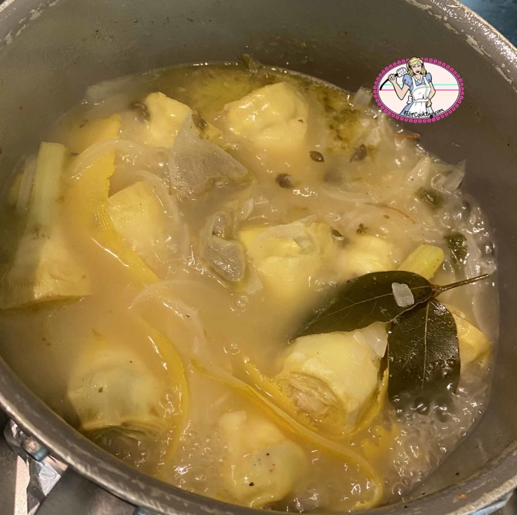 6. Porter à ébullition et laisser cuire 20 à 30 minutes à feu doux. Le temps de cuisson dépendra de la taille des artichauts.