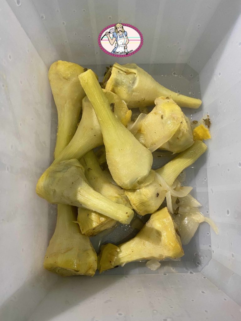 - Commencer par tourner les artichauts. Késako? Cliquez sur le lien et vous trouverez un petit film sur youtube vous expliquant la technique car je n’ai pas pu me filmer en train de le faire. Portez des gants, c’est indispensable sinon vous vous retrouverez avec les doigts….noirs. Et, je vous l’accorde, on a l’impression qu’il y a beaucoup de perte…. Disposez les artichauts dans un bain d’eau froide citronnée.
