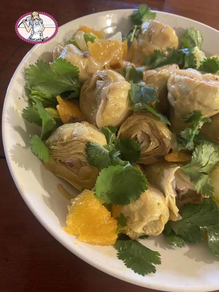 9. Faire réduire le jus de cuisson pendant 10 bonnes minutes. Passer le jus pour le débarrasser des herbes et des graines de coriandre puis ajouter le jus de fruit de la passion et continuer à feu doux jusqu’à ce que ce jus de cuisson épaississe un peu. Vérifier l’assaisonnement. Verser le tout sur les artichauts. Réserver aux frais. J’ai personnellement gardé quelques petits morceaux de zestes de citron mais jeté le reste.