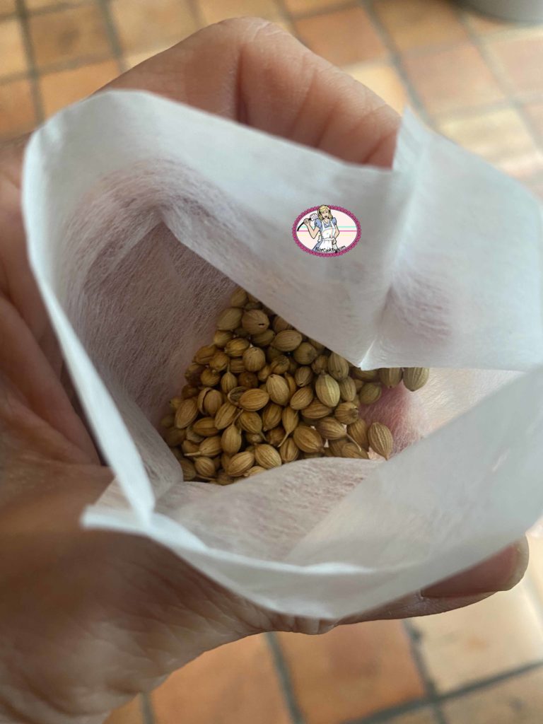 - Dans un sachet à thé ou de la gaze ou même une boule à thé, placer deux cuillers à café de graines de coriandre