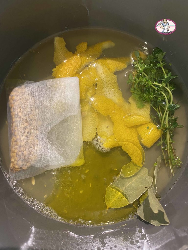 4. Dans une casserole, verser 2 verres d’eau, le vin blanc, le jus de citron, les zestes, l’huile d’olive, les graines de coriandre, un bouquet garni ou un peu de thym citron et 2 feuilles de laurier