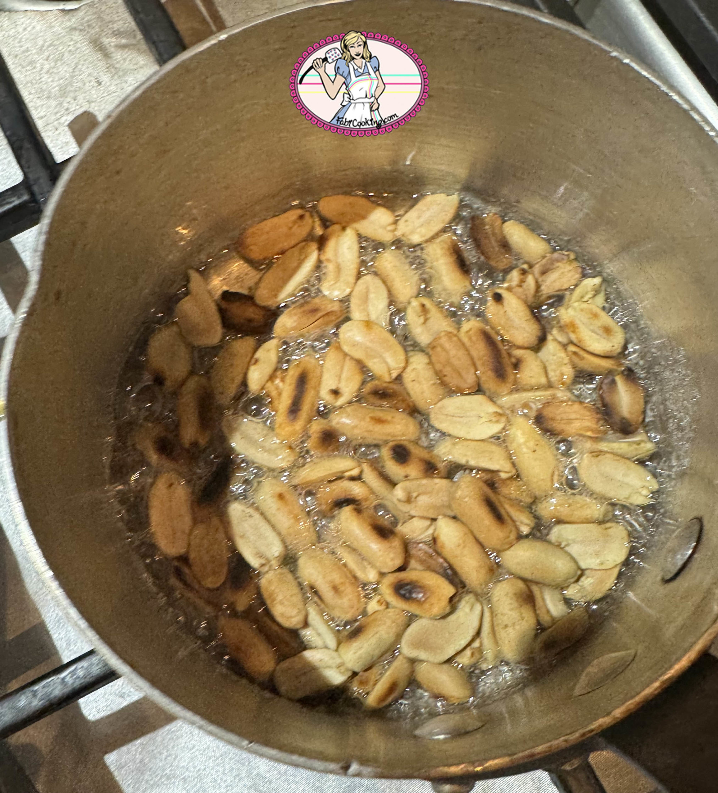- Ajouter les cacahuètes et mélanger rapidement pour bien les enrober. Le sucre va cristalliser avant de caraméliser.