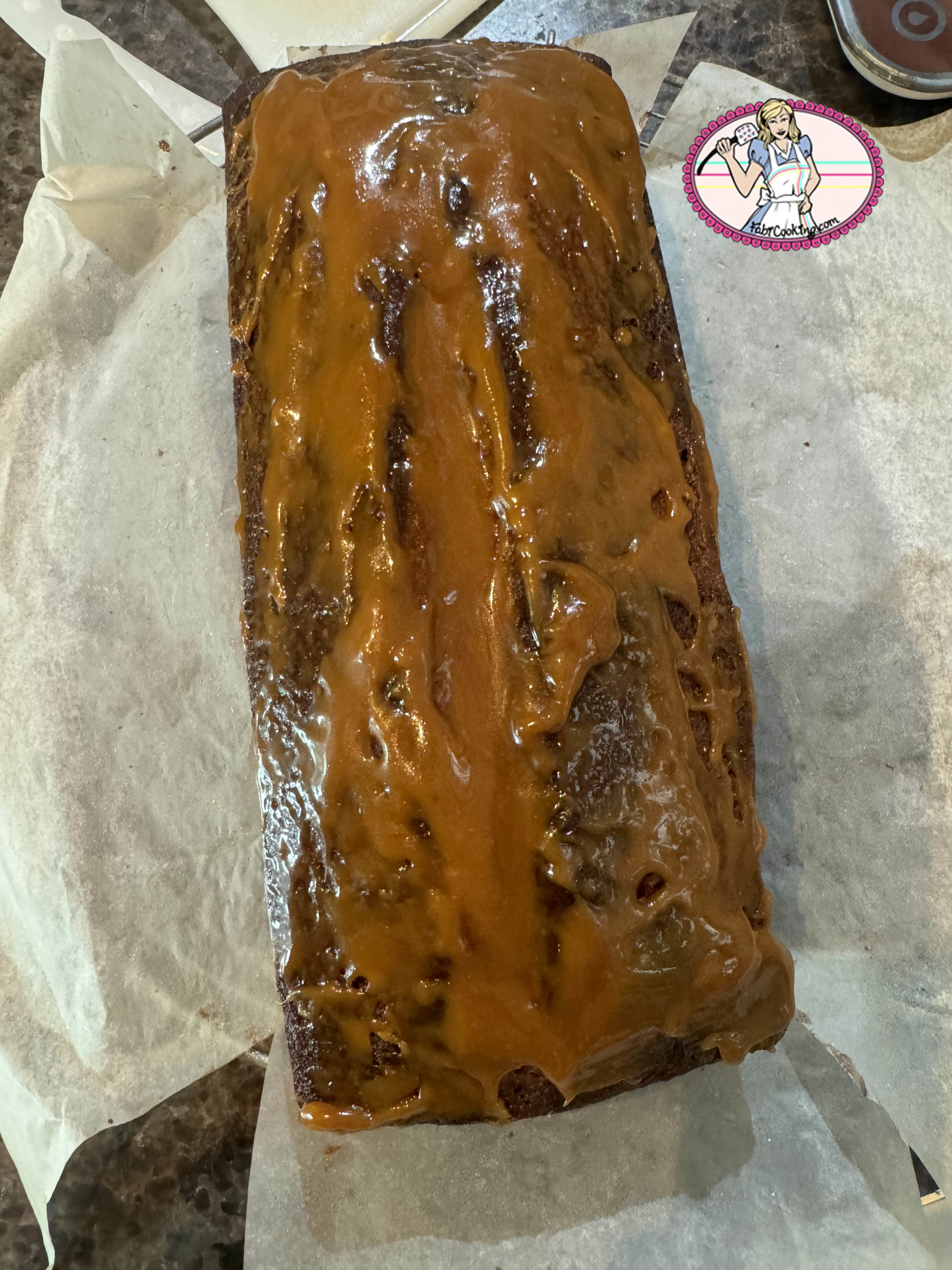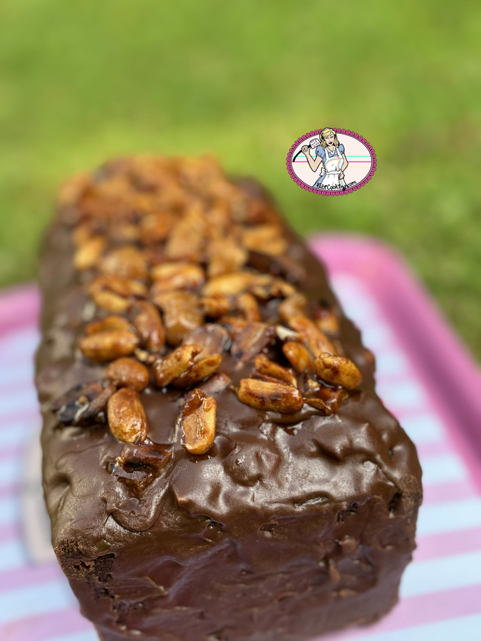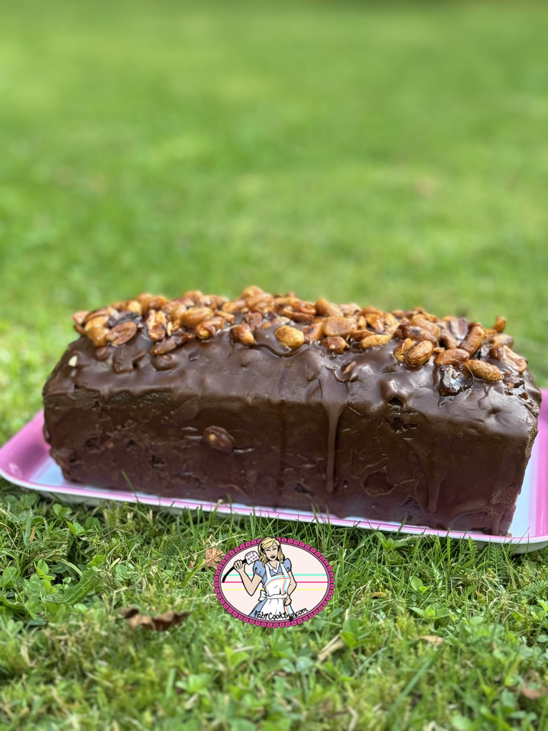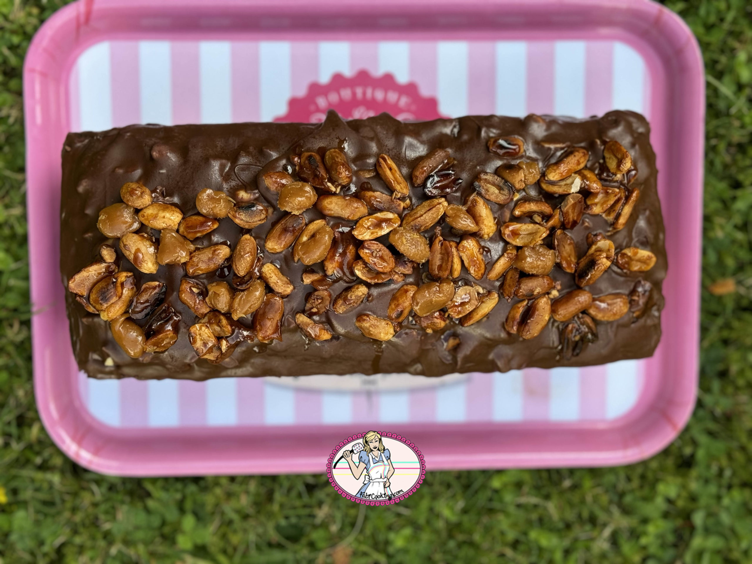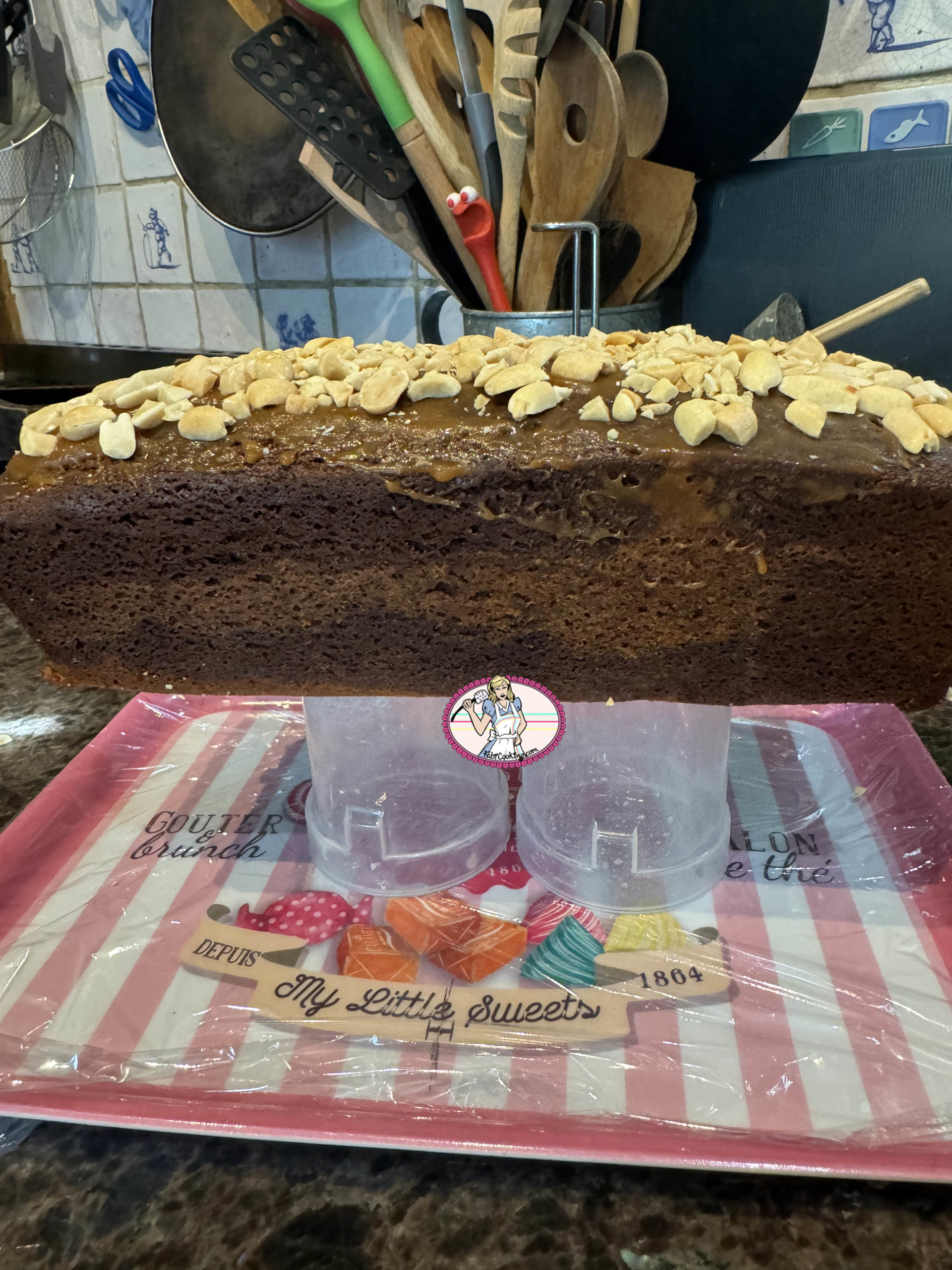 - Ensuite, poser le cake sur une grille avec une plaque en dessous ou comme moi….et verser le glaçage ( à 30 degrés environ) puis parsemer de cacahuètes caramélisées et de petits morceaux de caramel ( optionnel).