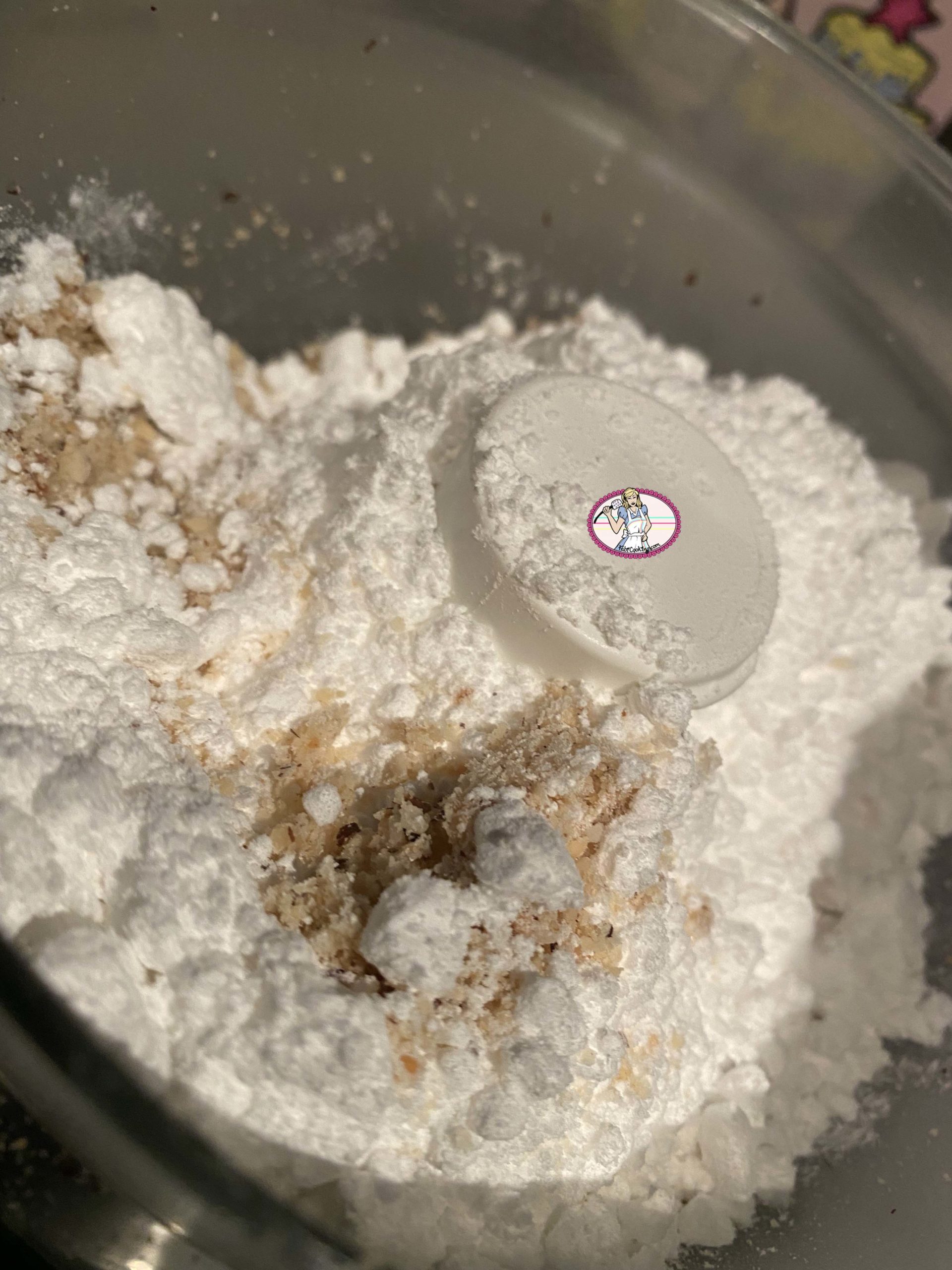 2. Incorporer 1/3 du sucre glace et actionner la lame par à-coups plutôt qu’en continu. Procéder ainsi pour le restant de sucre. Vous obtiendrez une pâte claire et un peu grumeleuse.