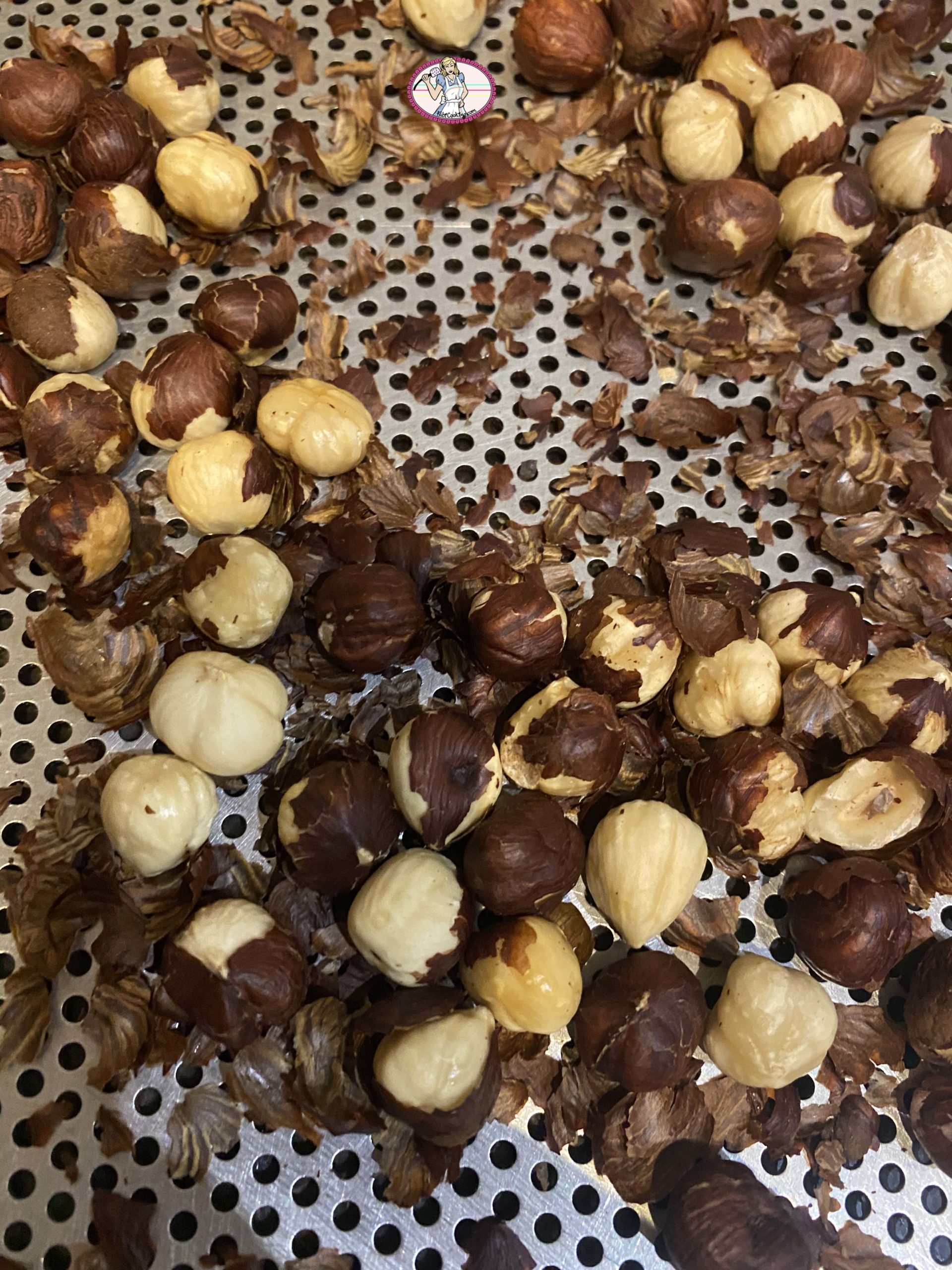 - Torréfier 175 g de noisettes à four préchauffé à 150° pendant 15 à 20 mn. Laisser refroidir 10 mn puis frotter entre les paumes de vos mains pour les émonder. S’il reste un peu de peau, ce n’est pas grave. Concasser grossièrement 75 g de ces noisettes et réserver le restant pour la pâte de noisette.