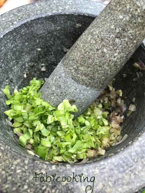 - Dans un mortier ou un hachoir à épices, placer le demi piment émincé, les grains de poivre vert et noir, la coriandre coupée grossièrement, l’ail dégermé et tranché et les échalotes coupées en petits morceaux.