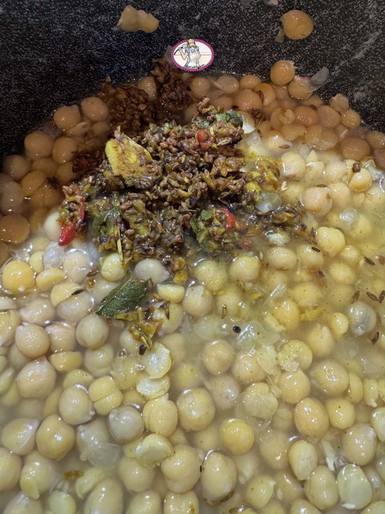 8. Débarrasser ce mélange dans la casserole ou se trouvent les pois chiches égouttés où vous aurez laissé un doigt d’eau de cuisson dans le fond si vous les avez fait cuire vous mêmes.