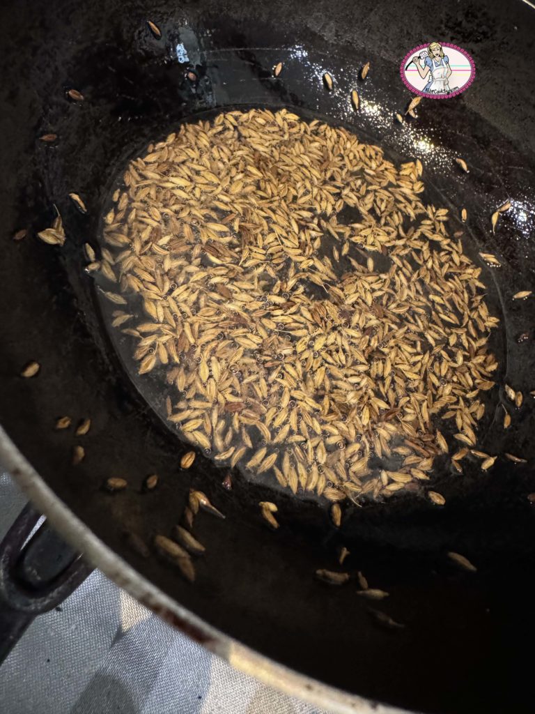 5. Dans une poêle, faire chauffer l’huile de coco et faire revenir les grains de cumin à feu moyen pour qu’ils ne brûlent pas