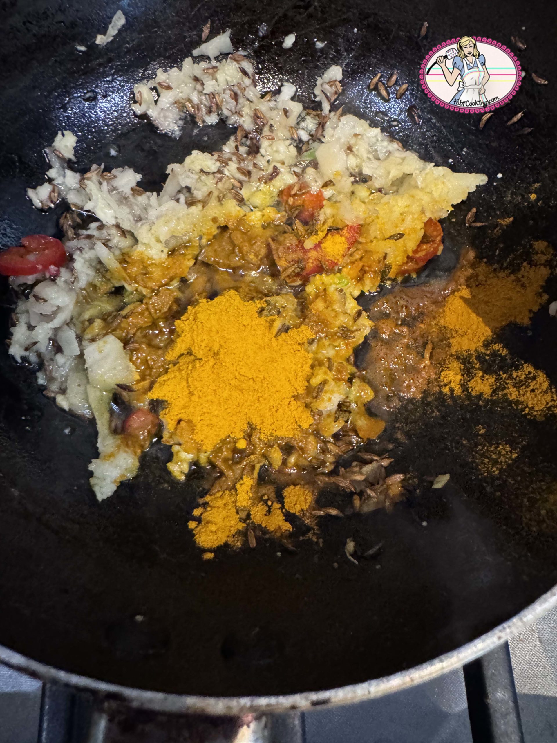 7. Quand vous sentirez bien les arômes, ajouter le curcuma, le garam masala, la cannelle. Bien mélanger.