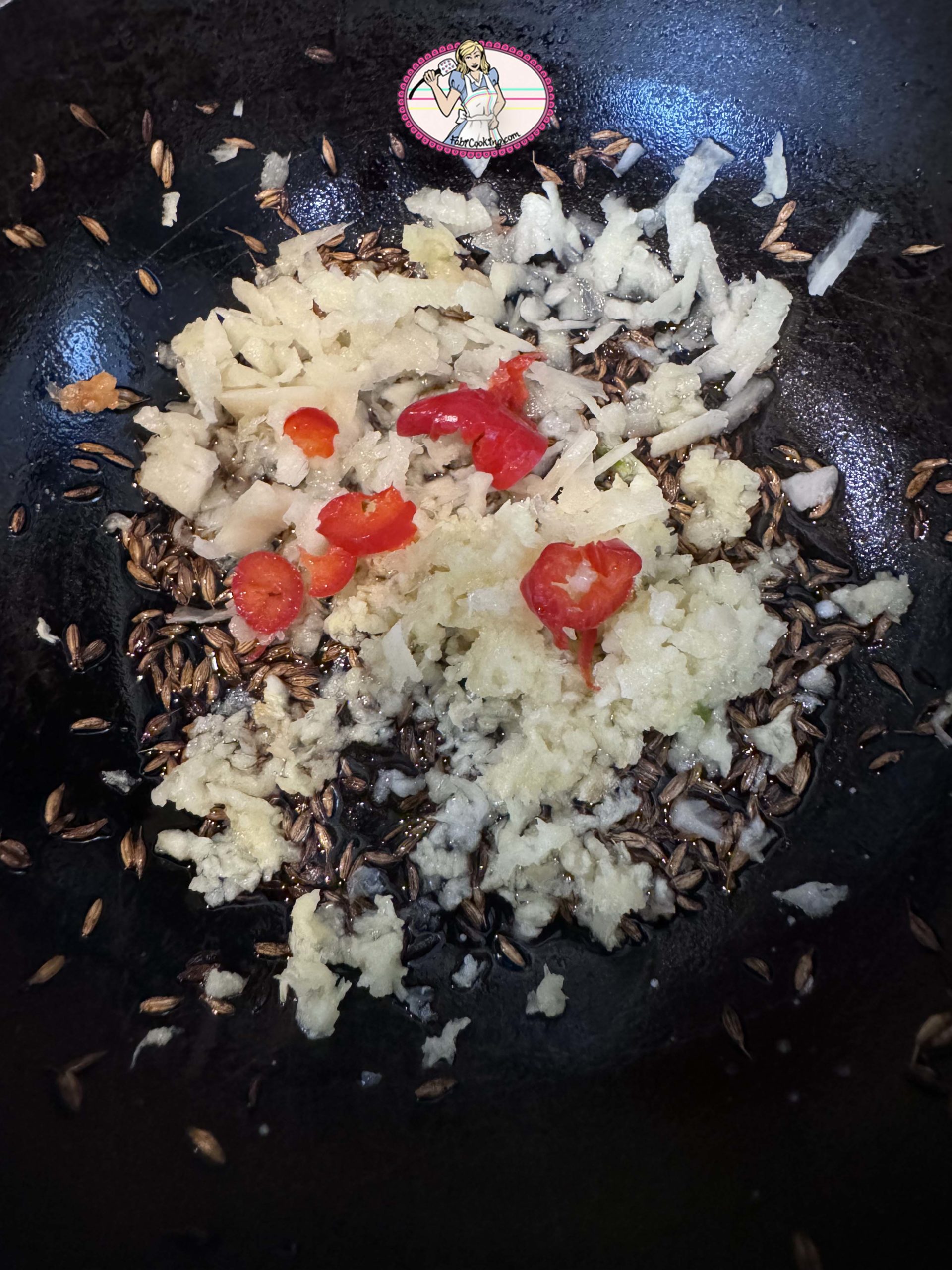 6. Joindre les morceaux d’ ail et les faire revenir avec le piment dont vous aurez ôté les grains et le gingembre râpé