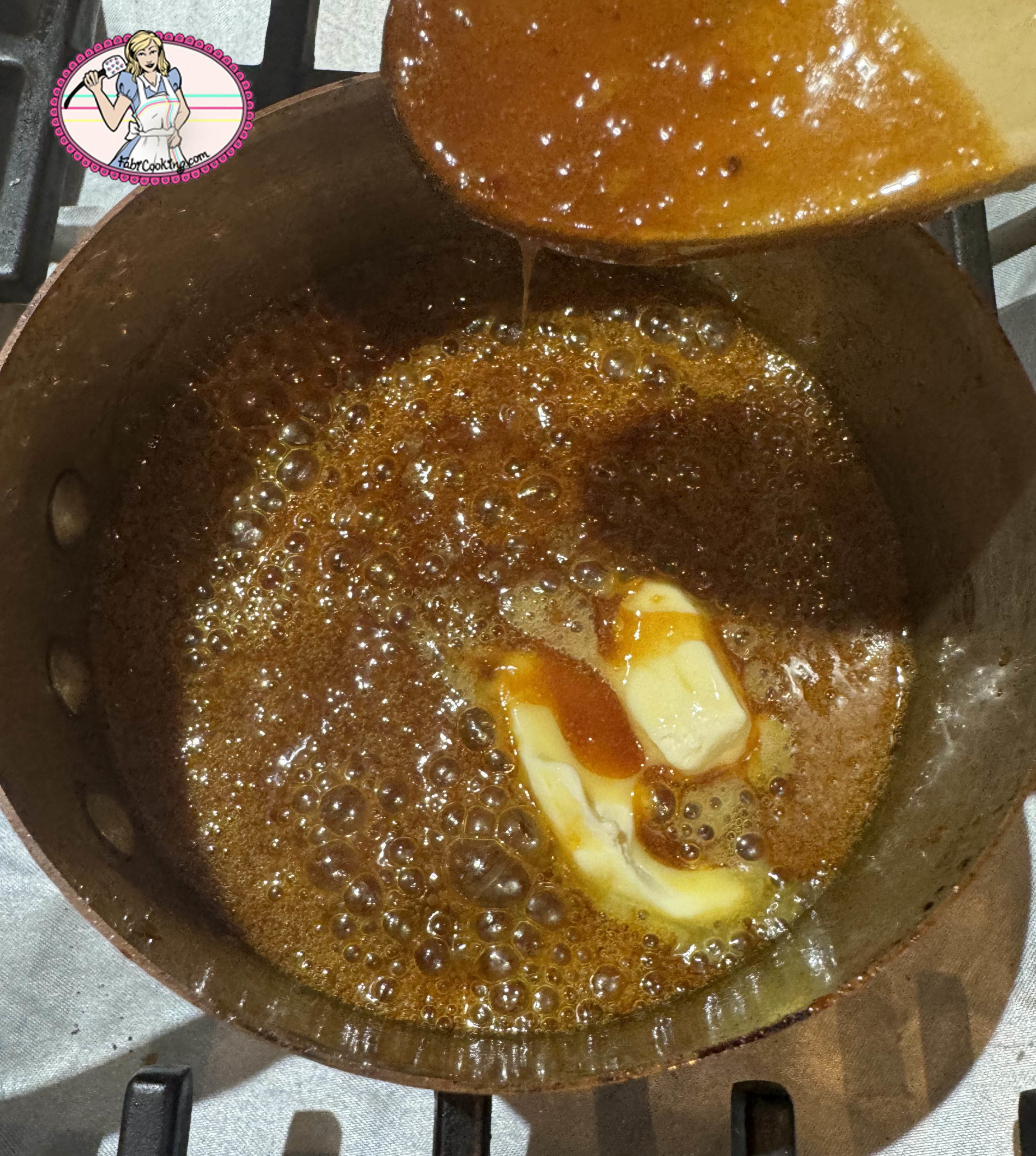 - Hors du feu, incorporer doucement et en se méfiant des projections, le beurre à température ambiante et coupé en morceaux. Mélanger rapidement: attention, le sucre ne doit pas re-carameliser!