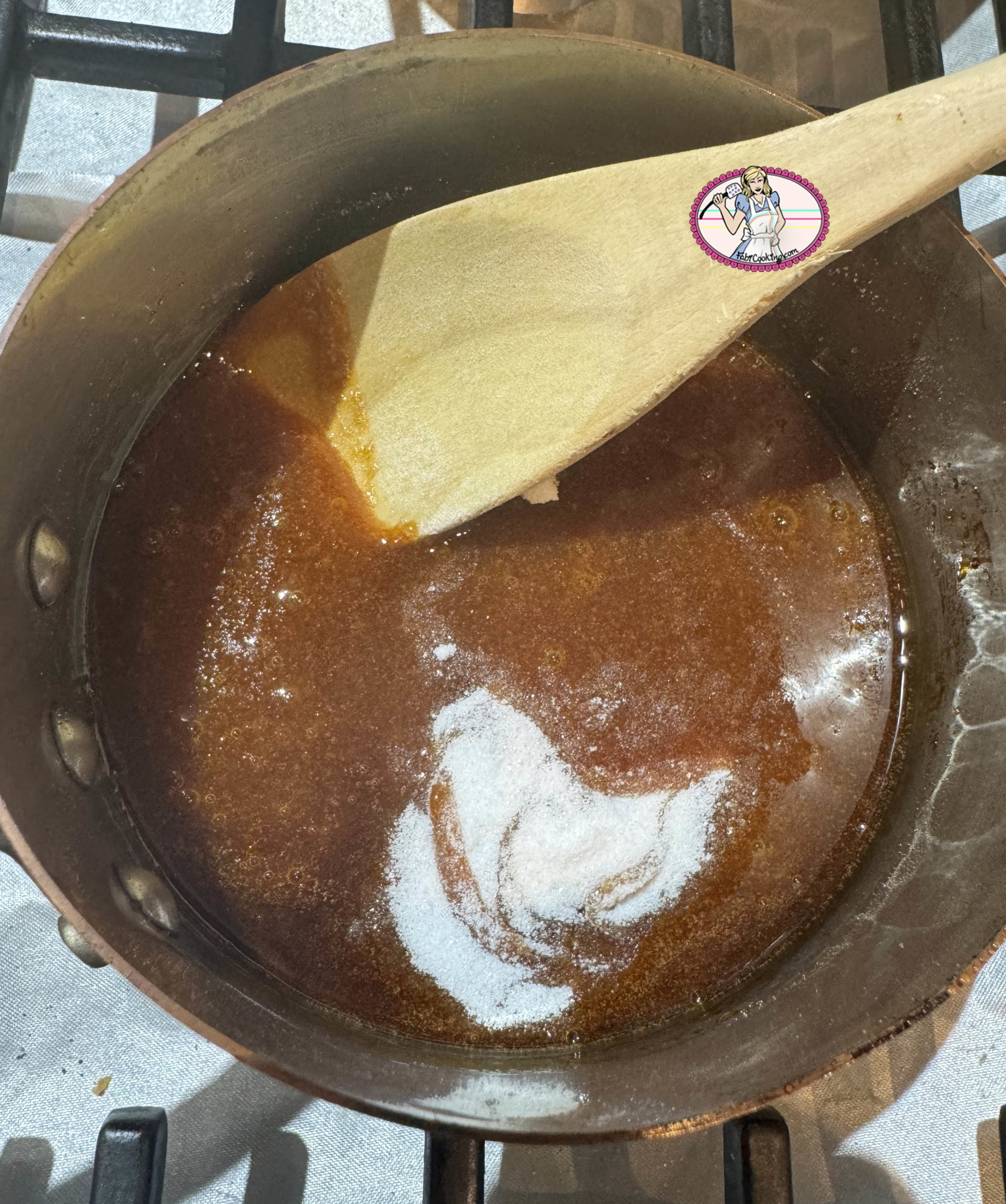- Quand il commence à fondre et à se colorer très légèrement, ajouter le second tiers et continuer le processus jusqu’à ce que tout le sucre soit dans la casserole. Ajouter la pointe de fleur de sel.